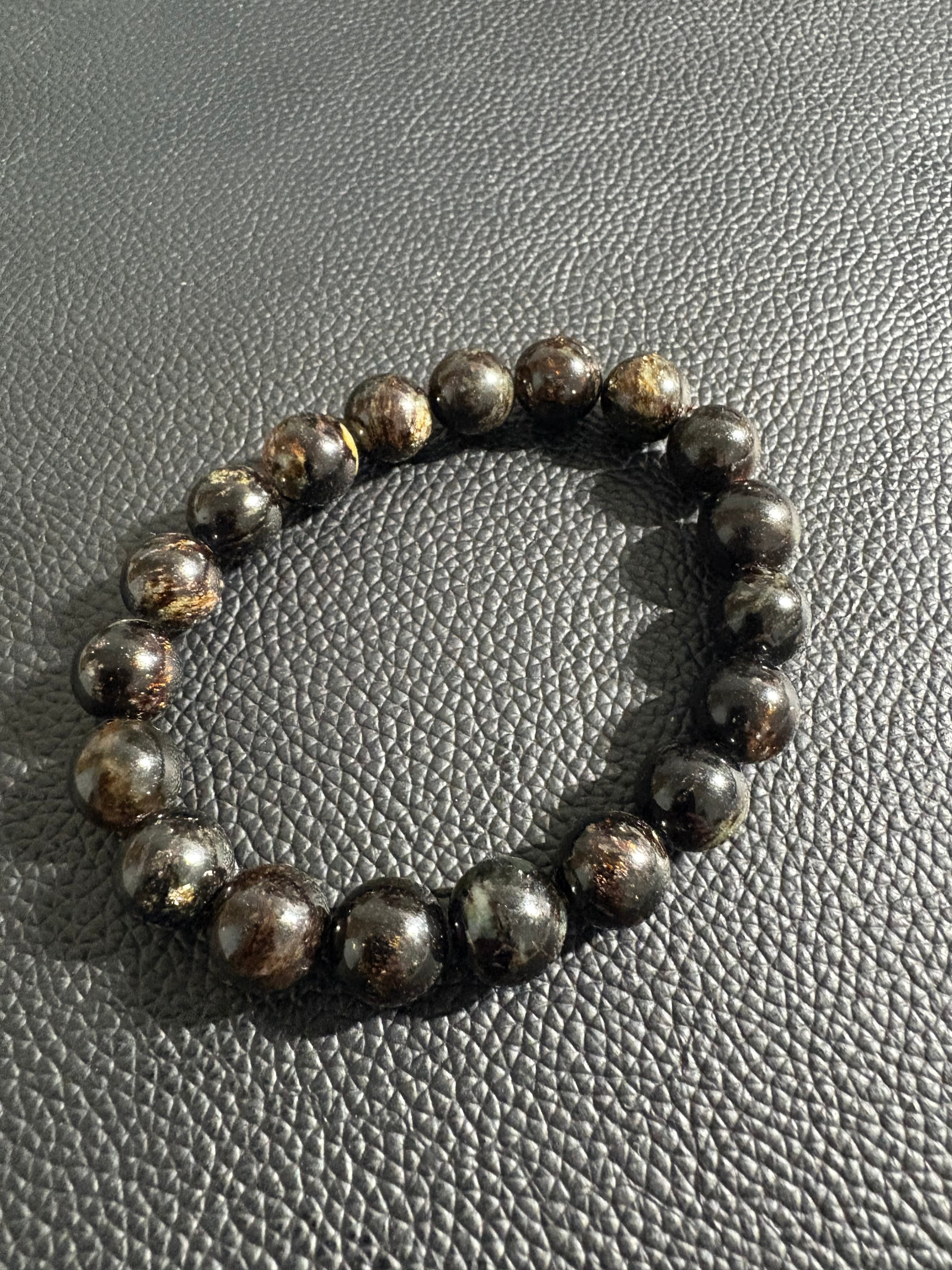 ブラックマイカの効果は、気持ちの安定、目標達成のサポート、仕事運・金運の向上、そして厄除けです。不安定な心を落ち着かせ、強い意志を育み、洞察力・探求心・冒険心を高めます。また、キラキラ輝くゴールドの輝きが金運アップや厄除けの役割も果たします。