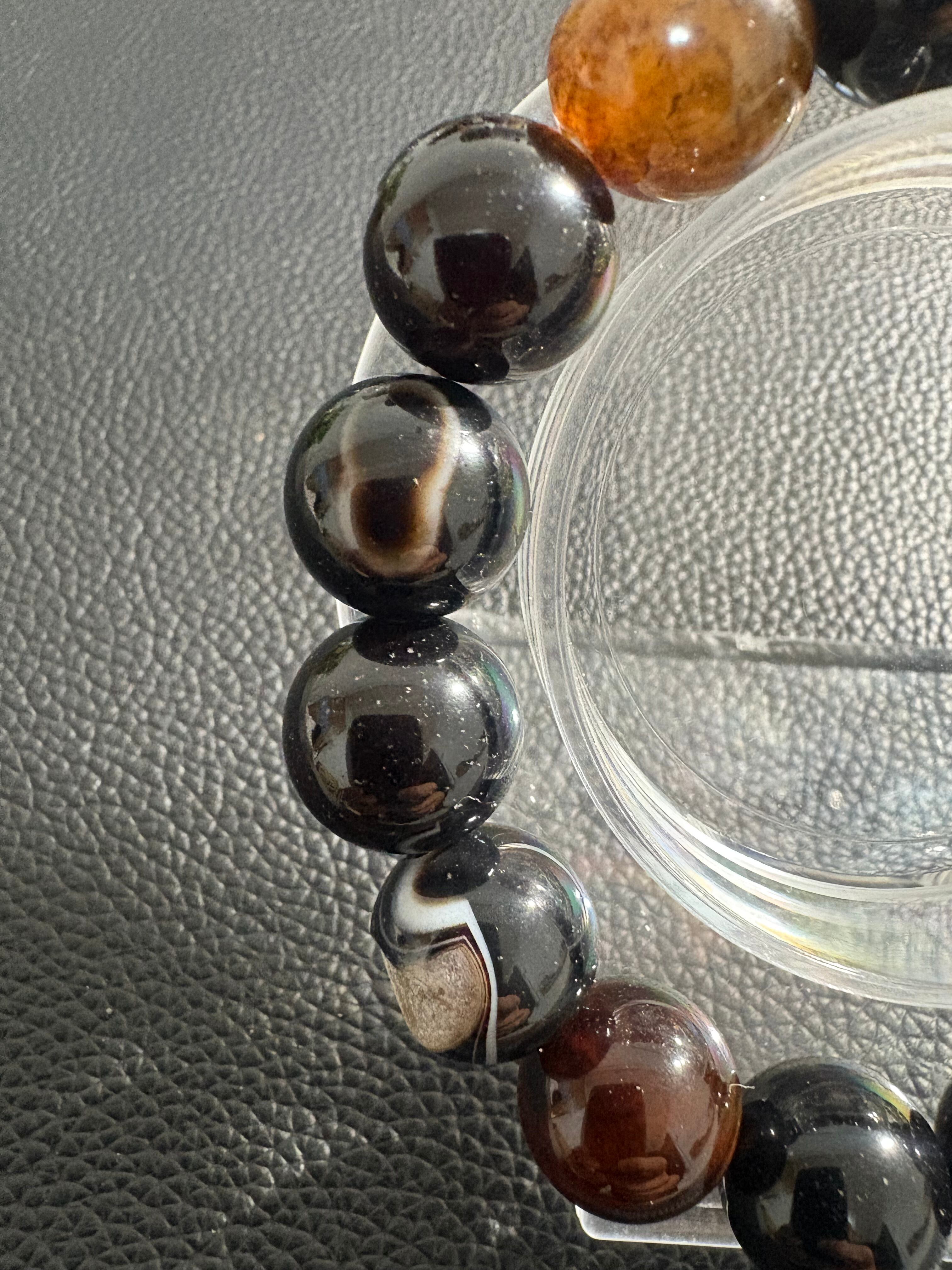 笑口オニキスブレスレットは、**「笑口メノウ(瑪瑙)」と「オニキス」**を組み合わせたもので、強力な「厄除け」「魔除け」の効果に加え、「金運上昇」や「人間関係の円滑化」といった様々な効果が期待できます。オニキスの「自己防衛」と「精神安定」の効果に、「笑口メノウ」の持つ「幸運」や「成功」のエネルギーが合わさることで、よりポジティブな効果が期待できるとされています。