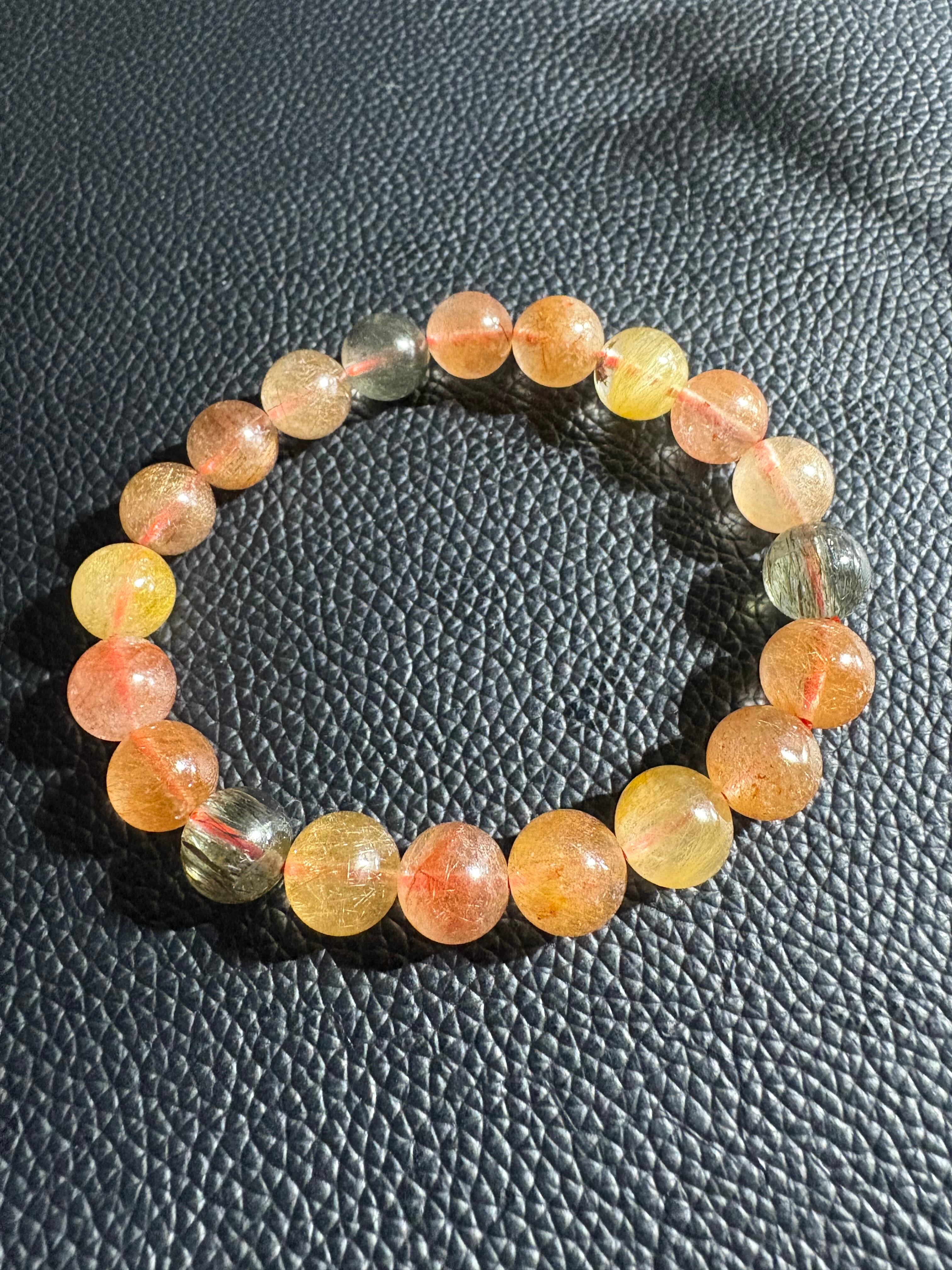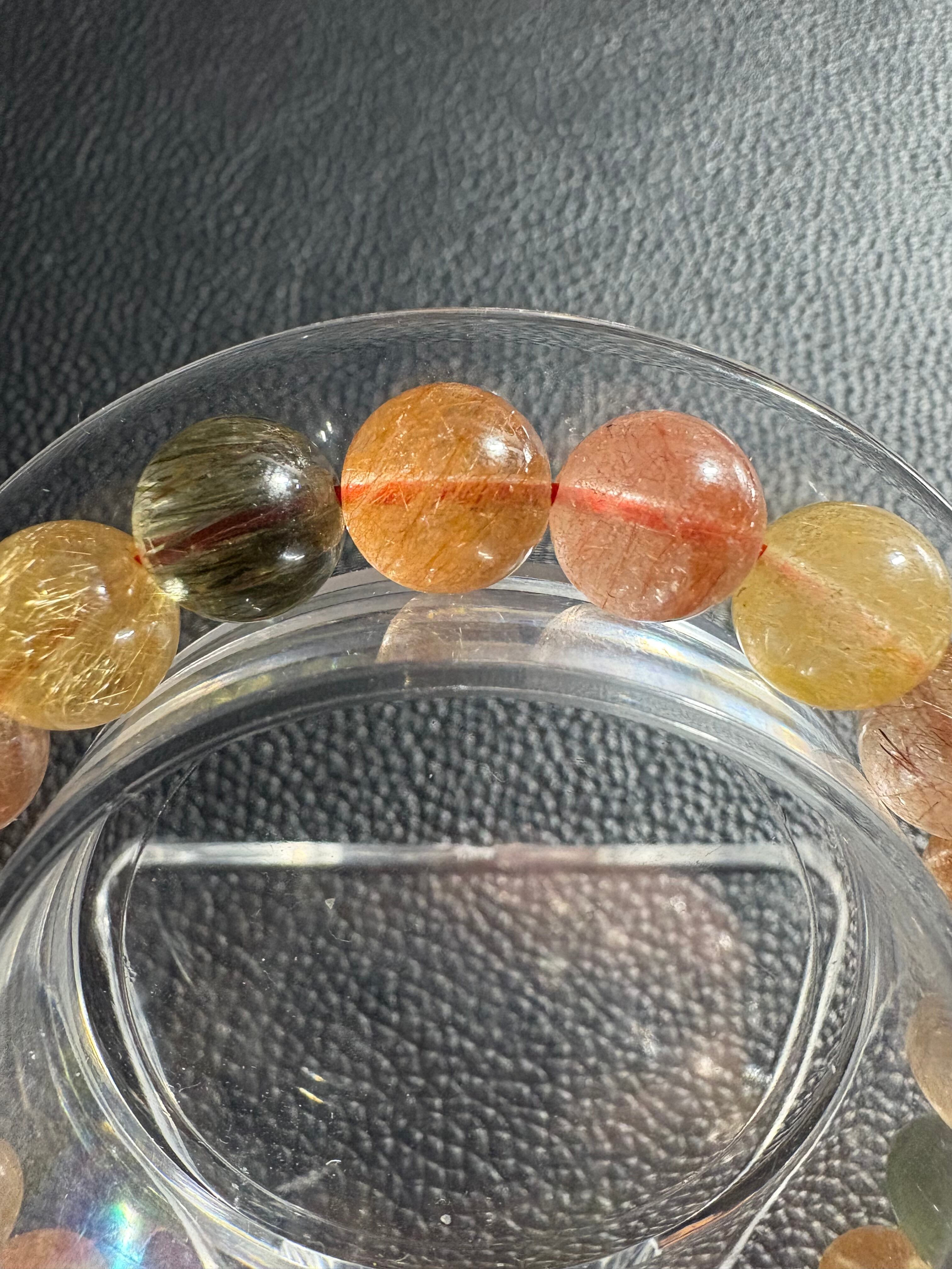 カラフルルチルブレスレットには、金運・財運の向上、直感力・洞察力の強化、目標達成のサポート、積極性・行動力の向上、そして心身の浄化・守護といった効果があるとされています。複数のルチルの色を持つことで、それぞれの石が持つポジティブなエネルギーを増幅し、持ち主の願望やエネルギーを強くサポートすると考えられています。