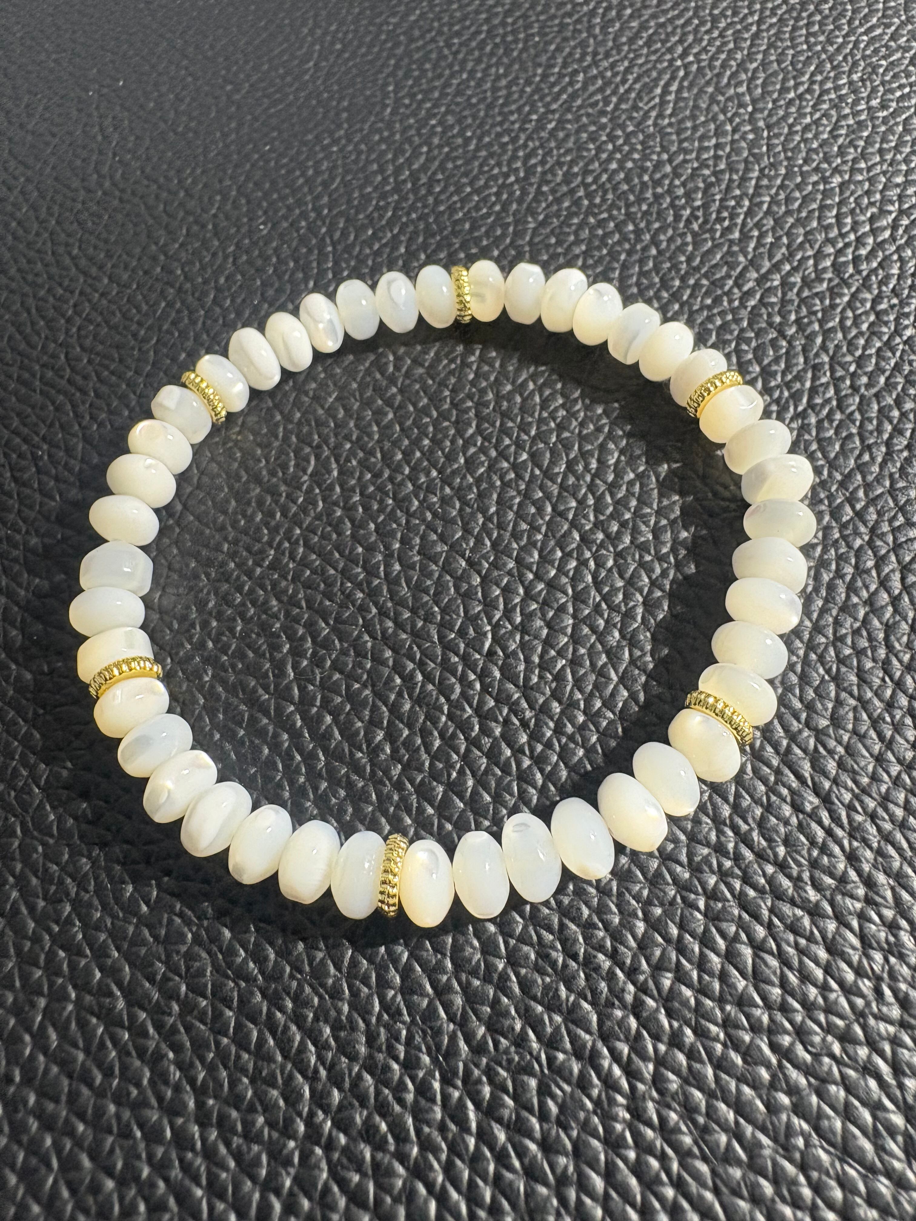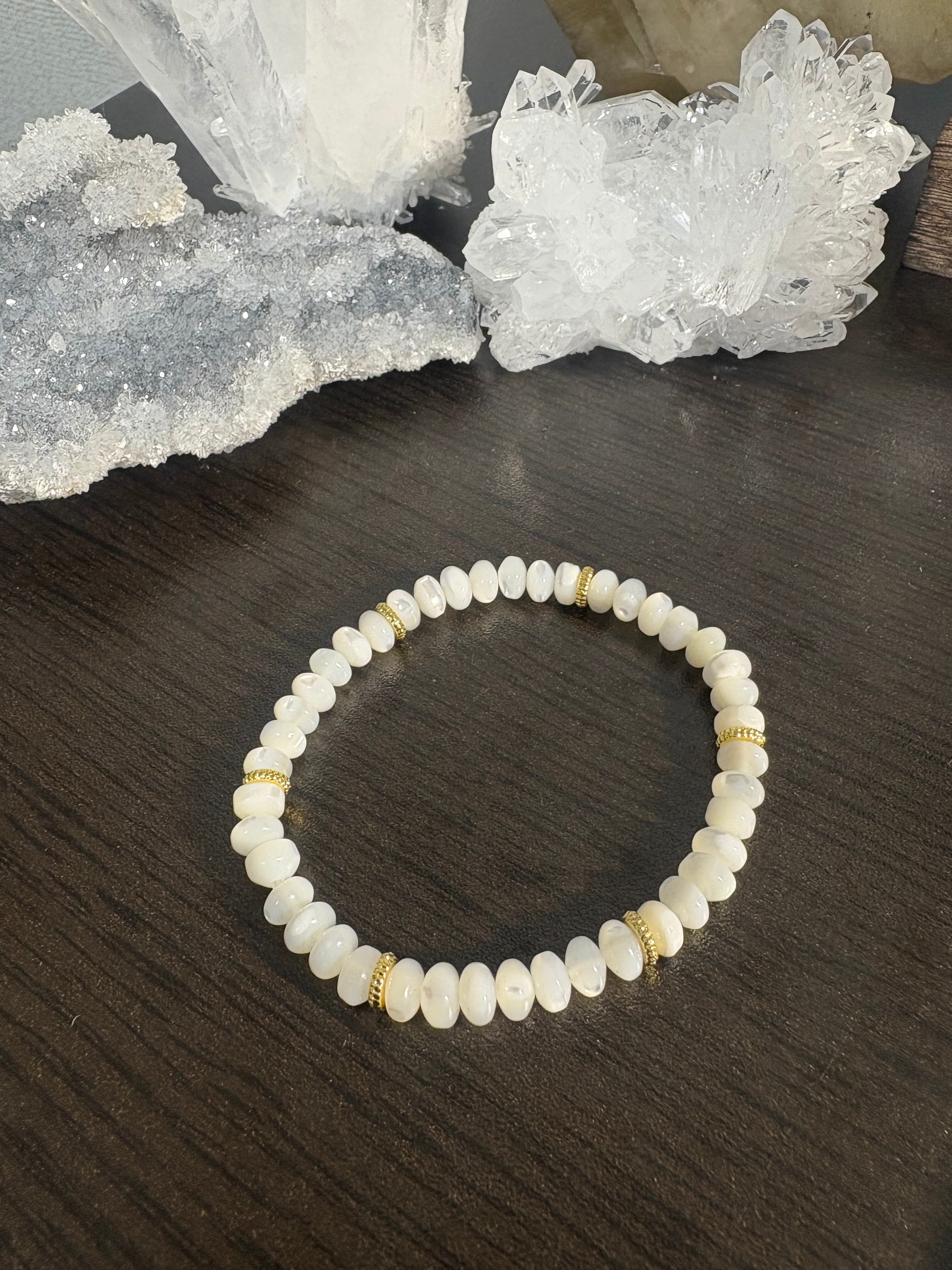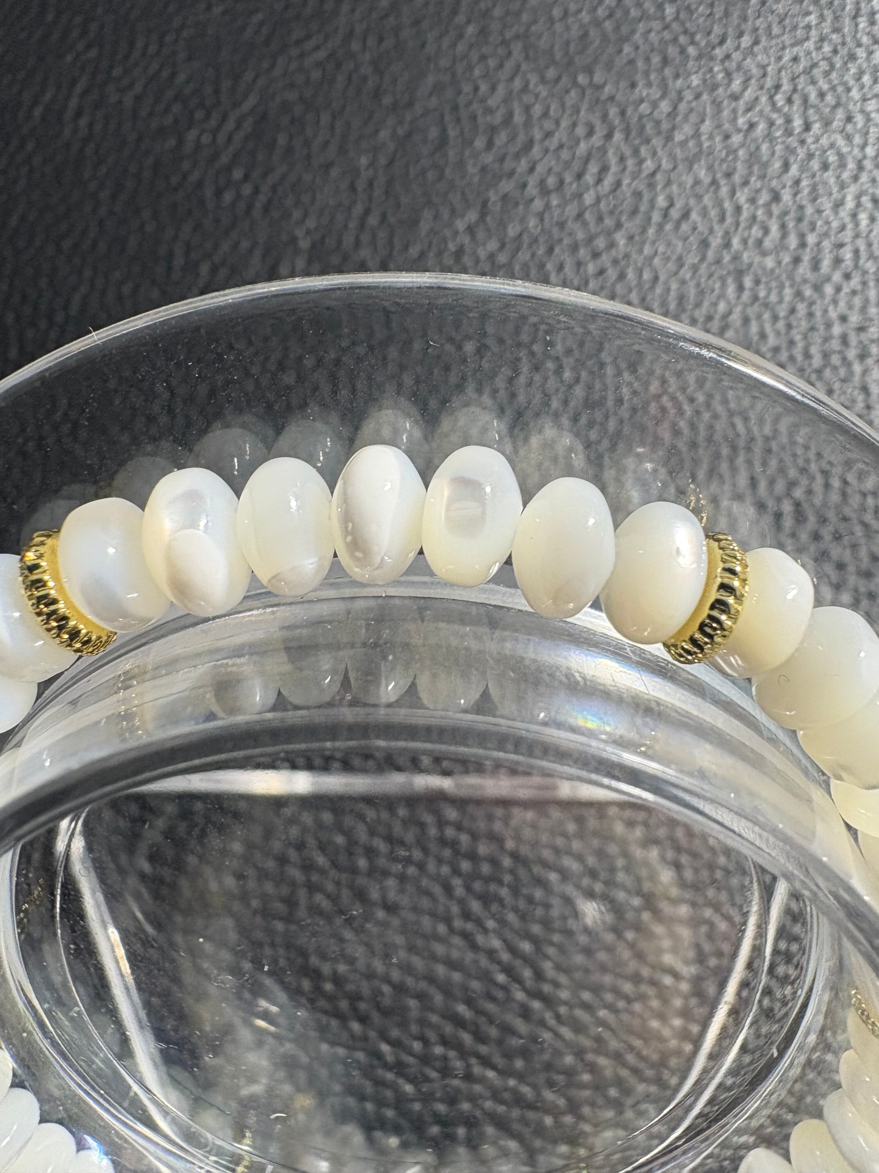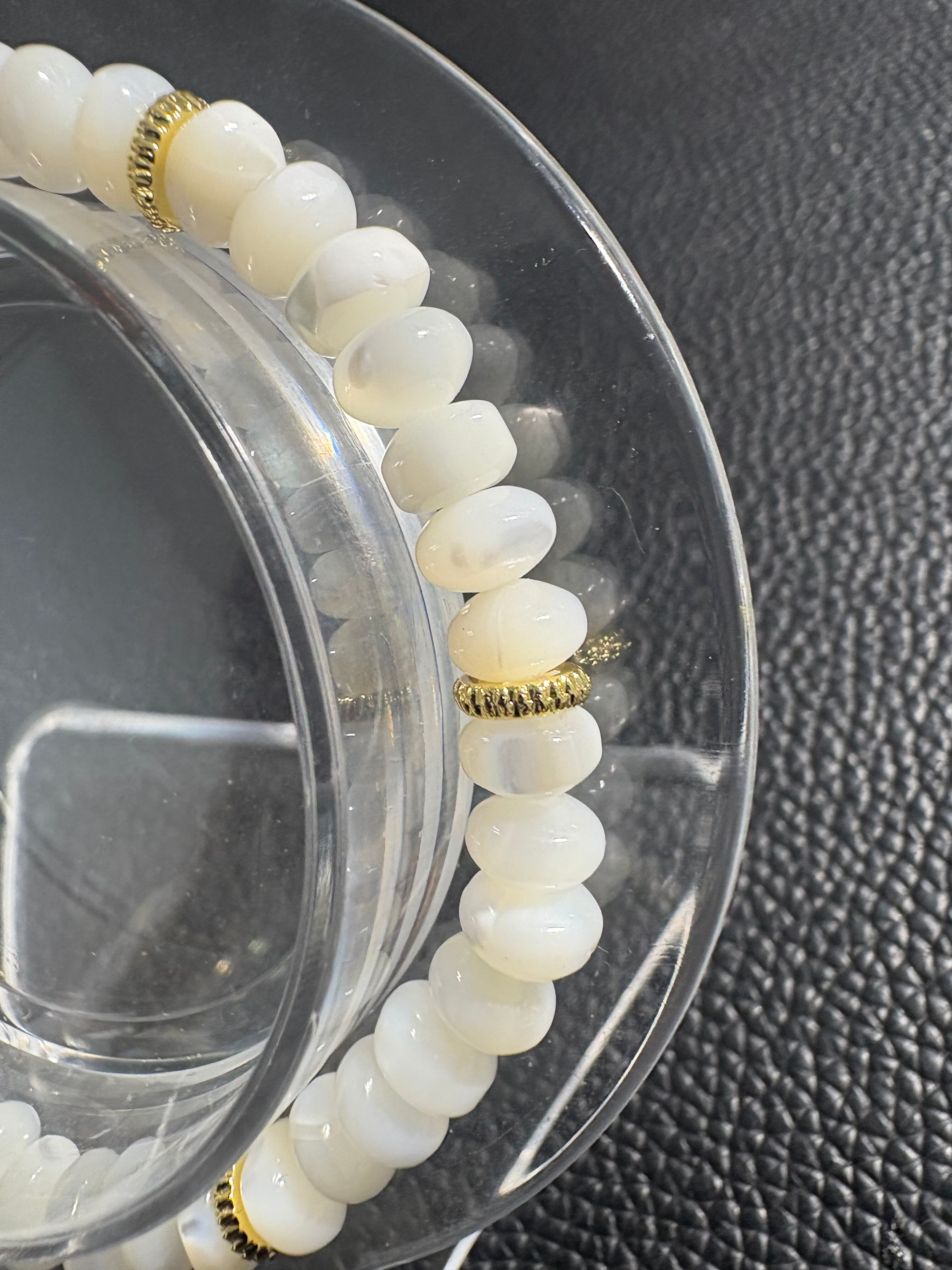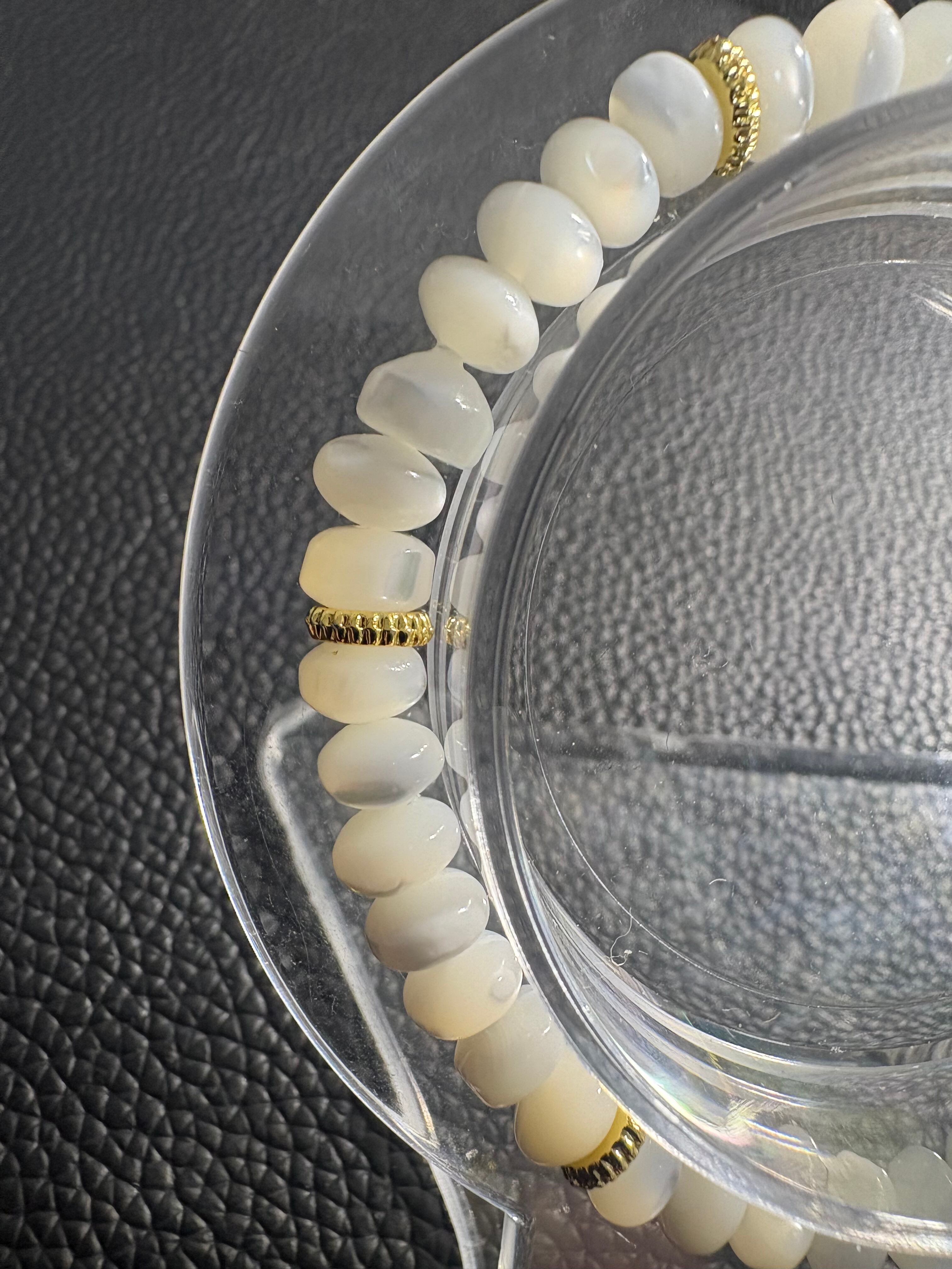 マザーオブパールのブレスレットは、母性の象徴とされ、家族愛や親子愛を深め、優しさや癒しをもたらす効果が期待されます。また、女性の魅力を高め、美容にも良いとされ、安産や育児のお守りとしても人気です。