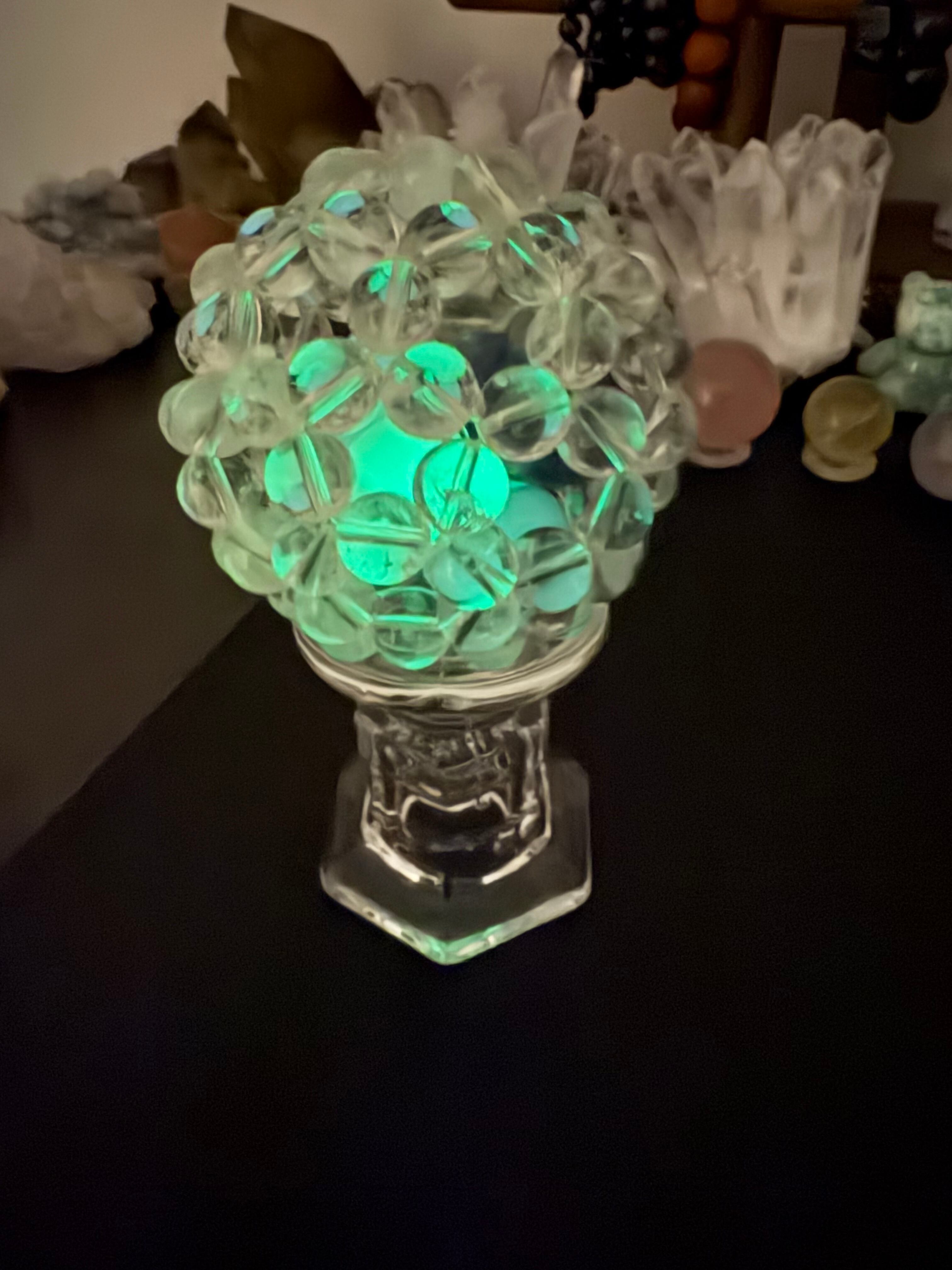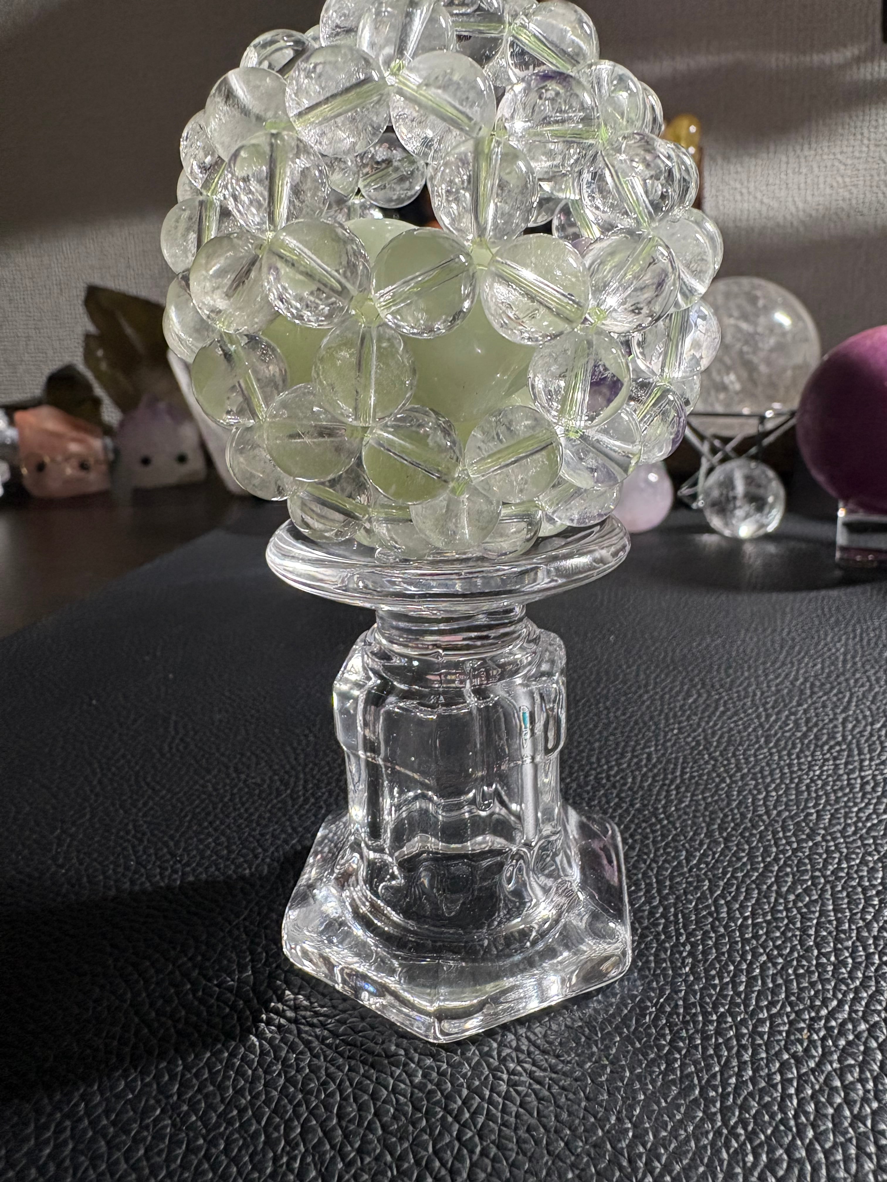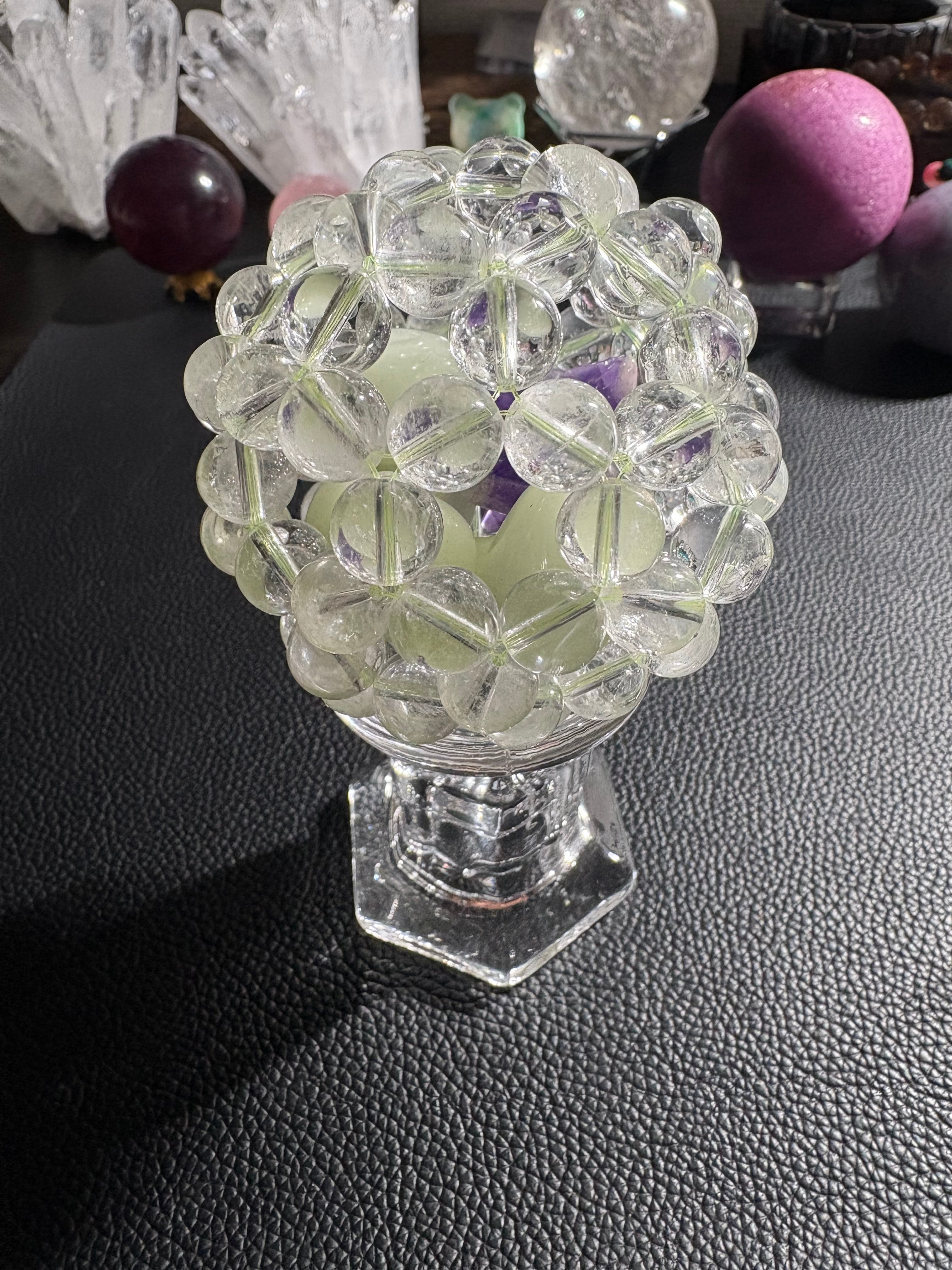 ✨水晶フラーレン(夜光石、アメジストマカバスター入り)台座付き✨ サイズ66ミリ(10ミリ玉) ※ 夜光石(やこうせき)は、太陽光や蛍光灯などの光を吸収して暗闇で自ら発光する「蓄光石」のことで、ガラス粉末と夜光塗料を混ぜて作られる人工石です。ぼんやり光ってとても綺麗です✨※フォローして頂き、10%OFFクーポンをご利用下さい☆