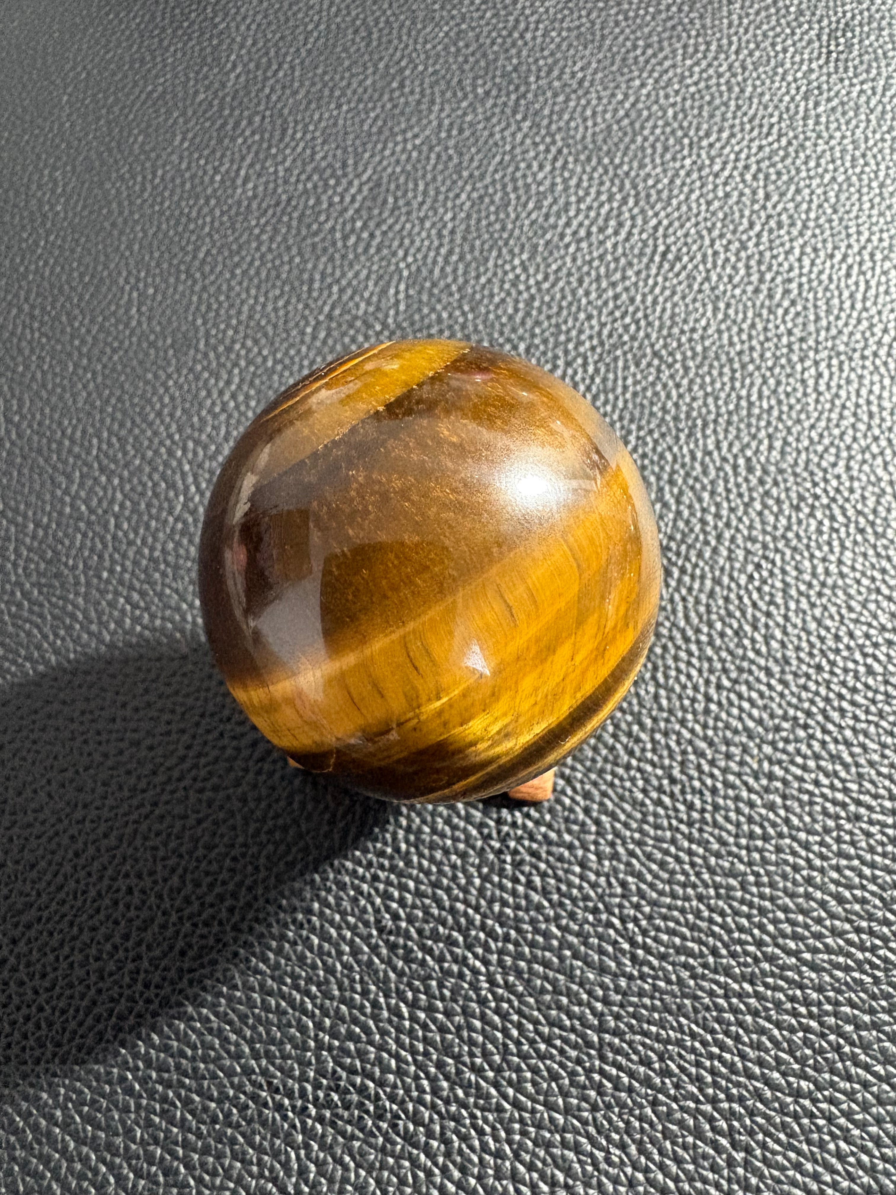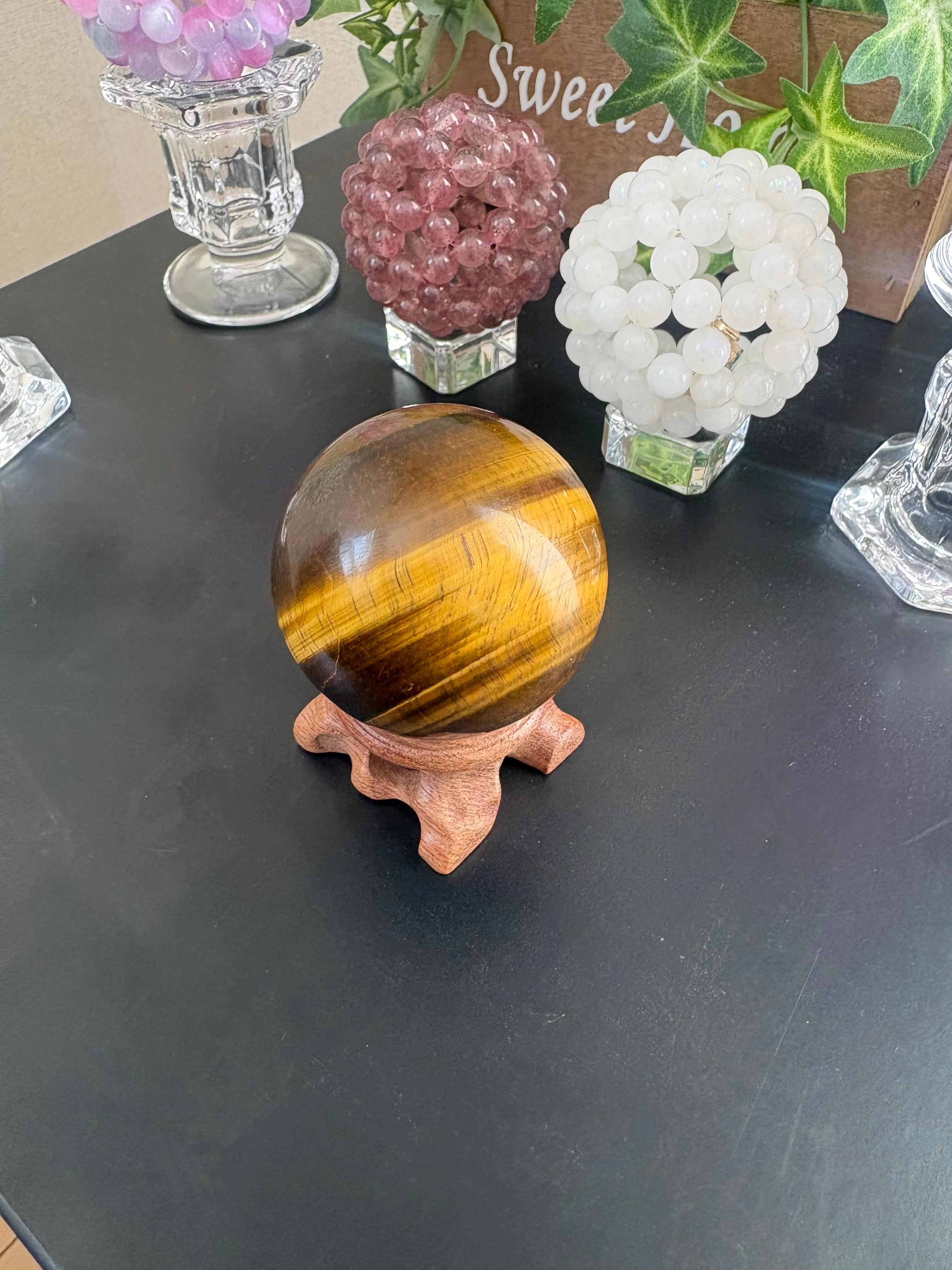 イエロータイガーアイ(黄虎目石)のスフィア(丸玉)は、金運・仕事運UP、洞察力・決断力向上、自己肯定感UP、そして強力な魔除けの効果があるとされ、特にビジネスでの成功、チャンスを掴む、目標達成をサポートするパワーストーンです。虎の眼のような輝き(キャッツアイ効果)が本質を見抜き、前向きな行動を促し、ネガティブなエネルギーから守るとされます。