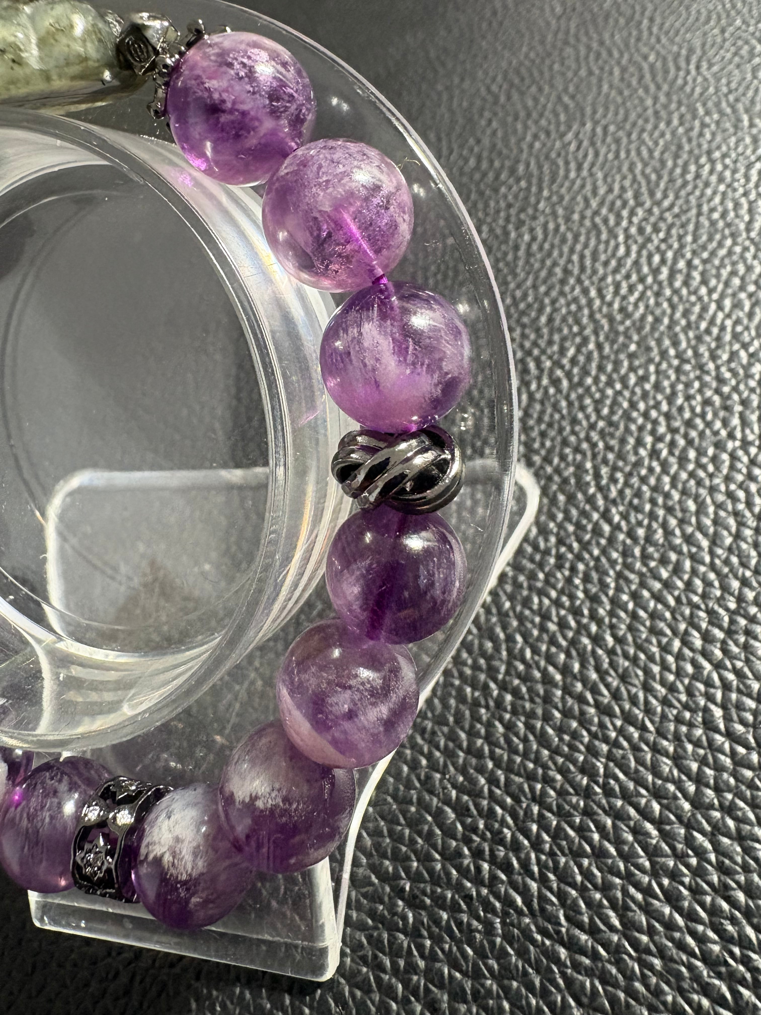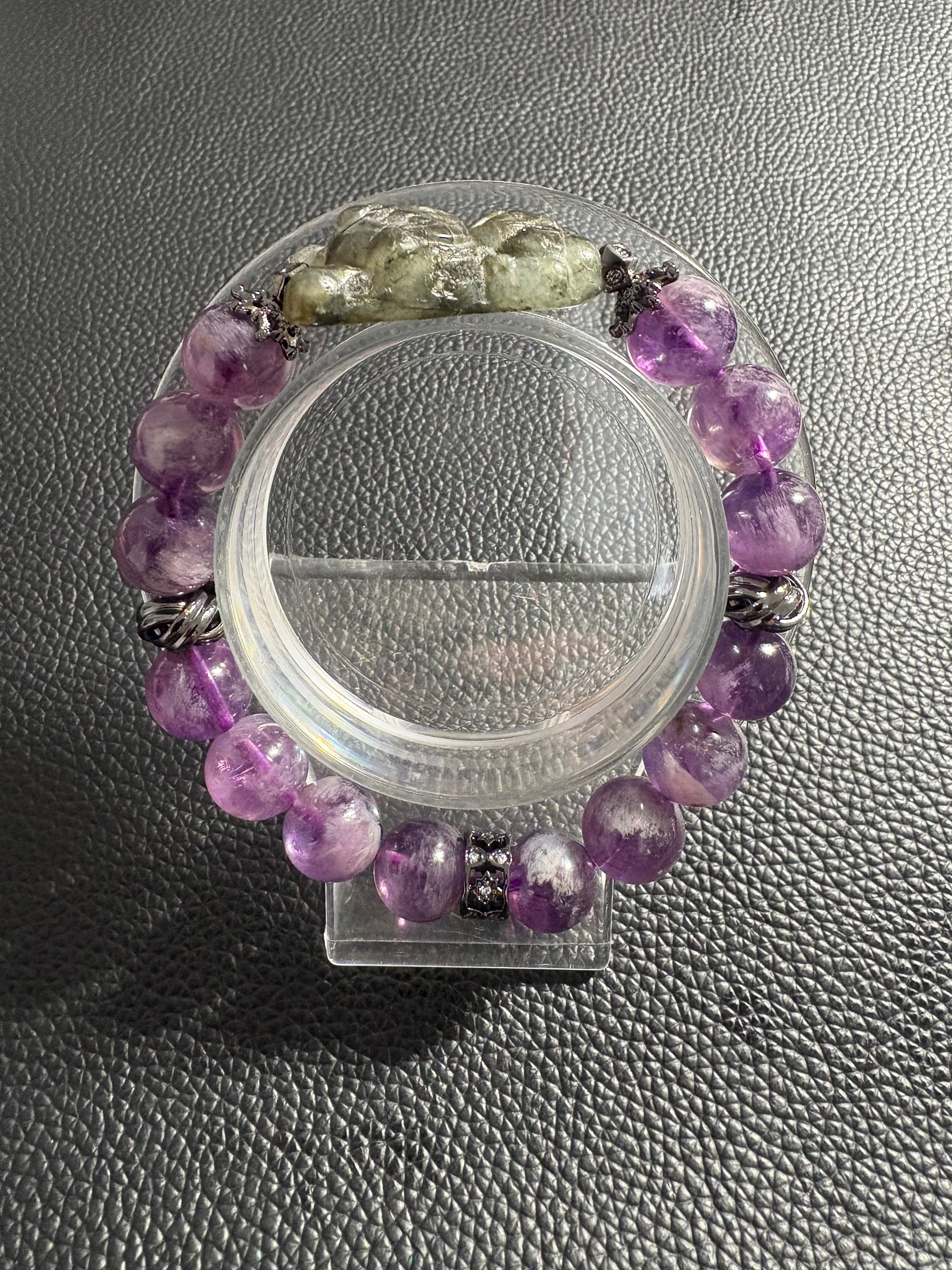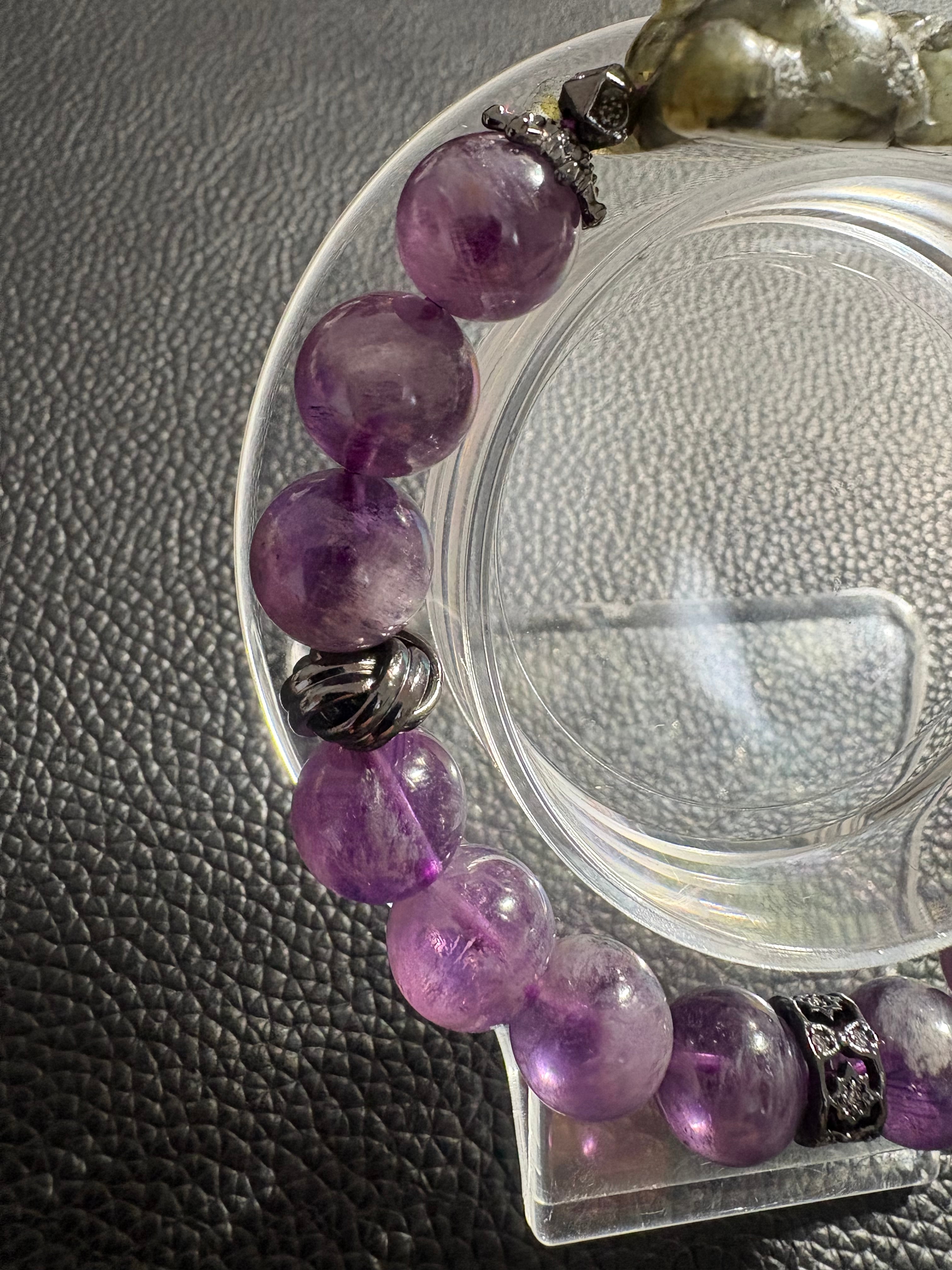 神秘的な輝きを放つラブラドライトと、優しい紫色のアメジストを組み合わせたブレスレットです。