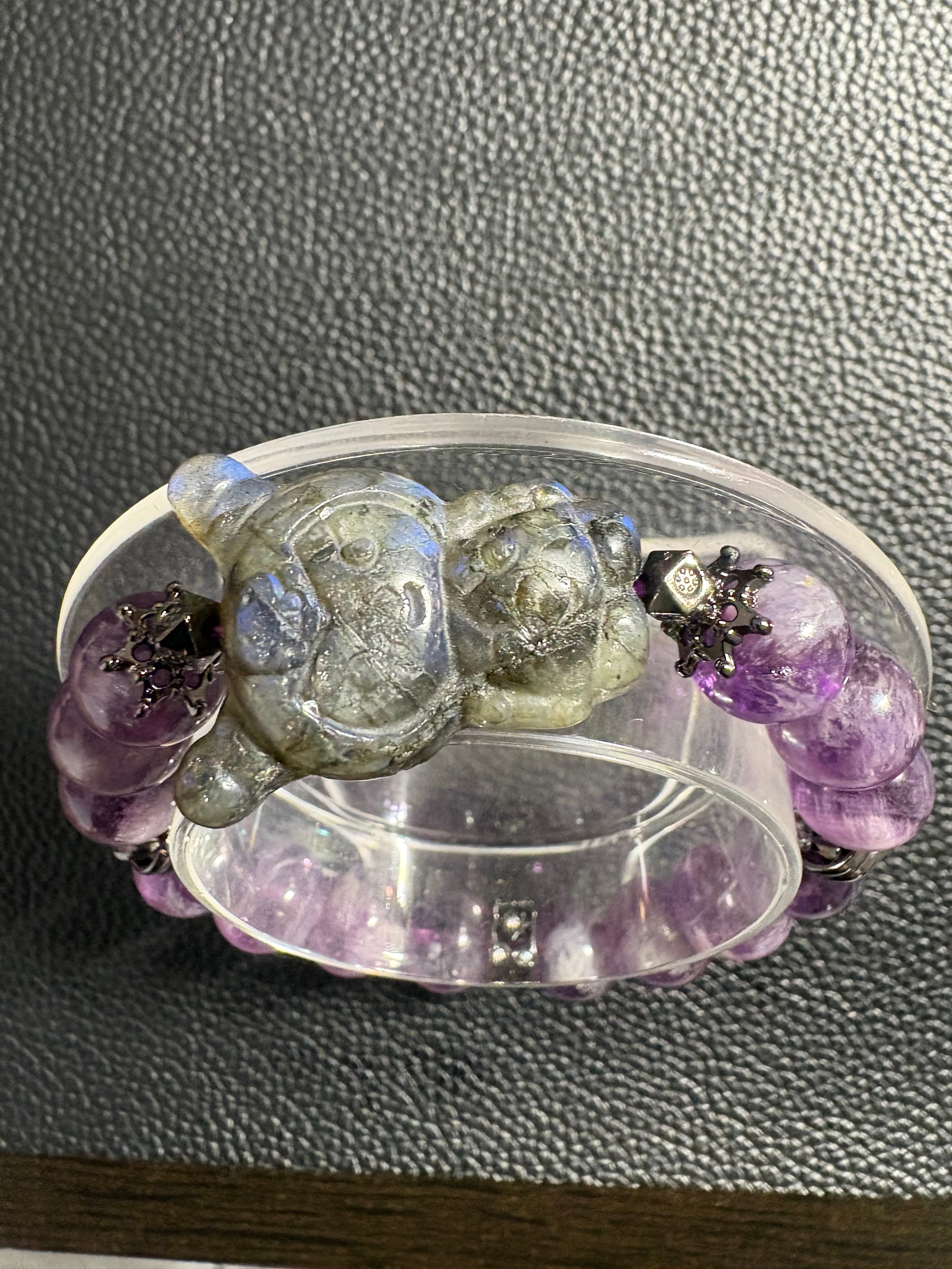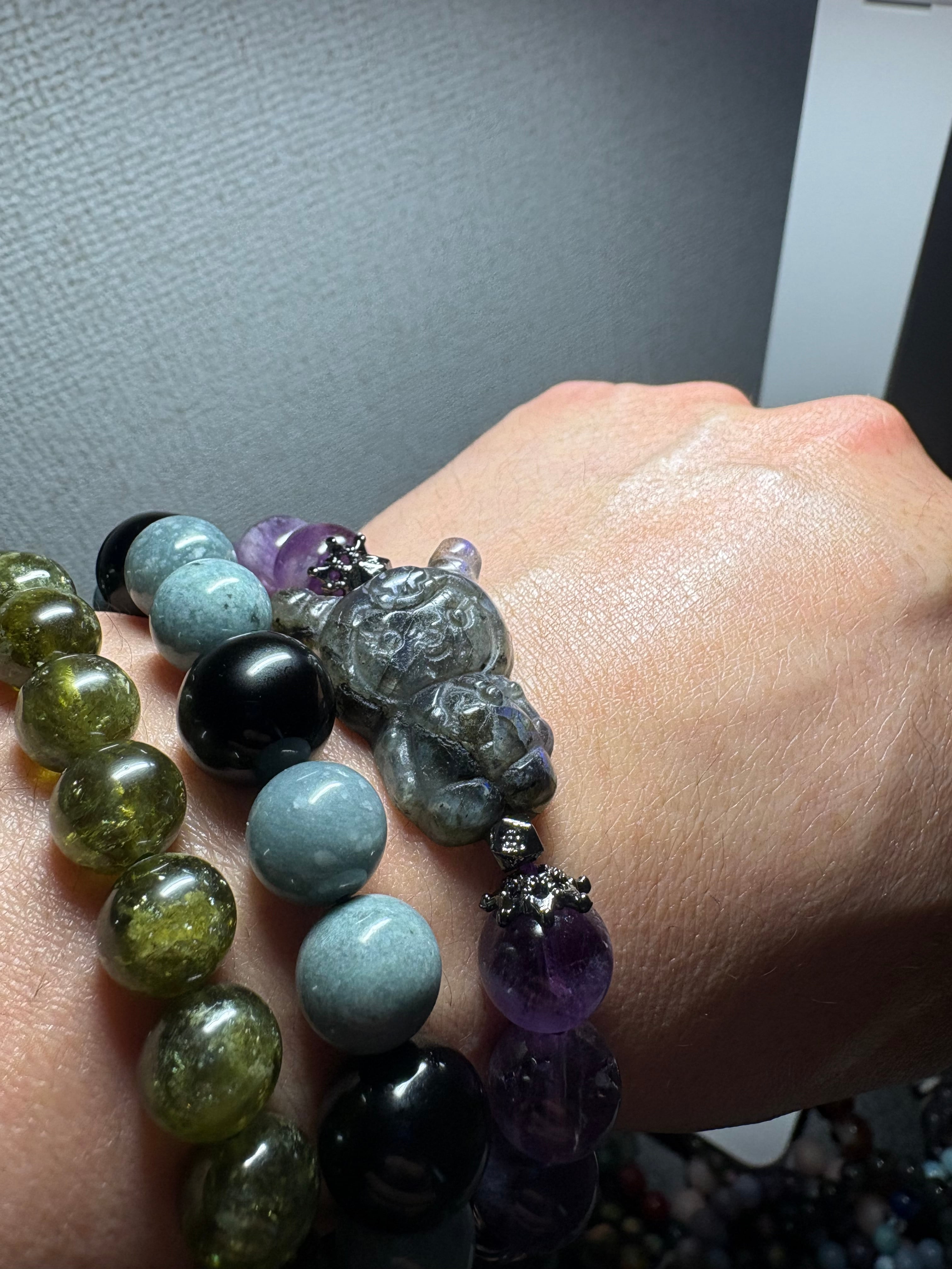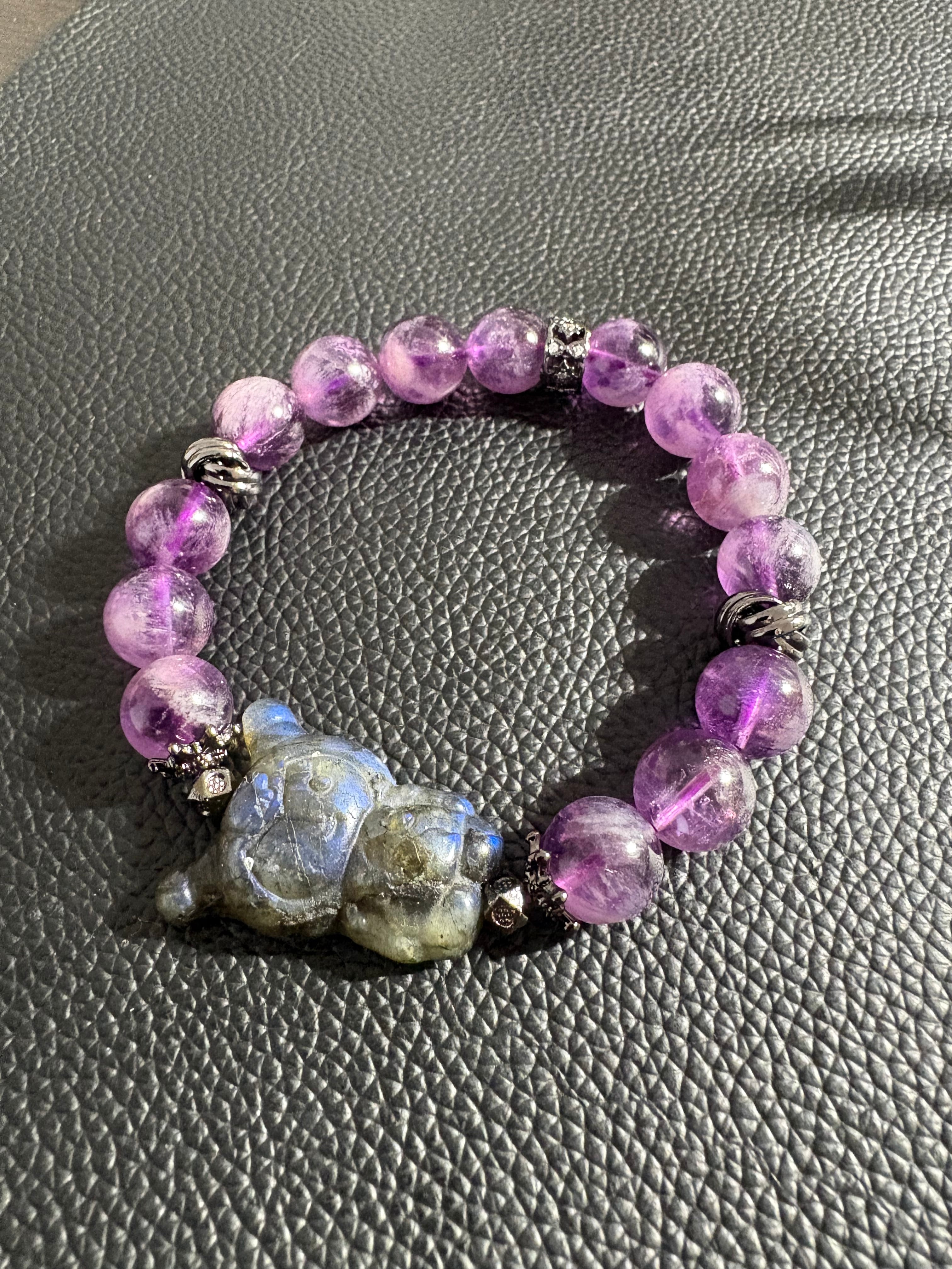 神秘的な輝きを放つラブラドライトと、優しい紫色のアメジストを組み合わせたブレスレットです。