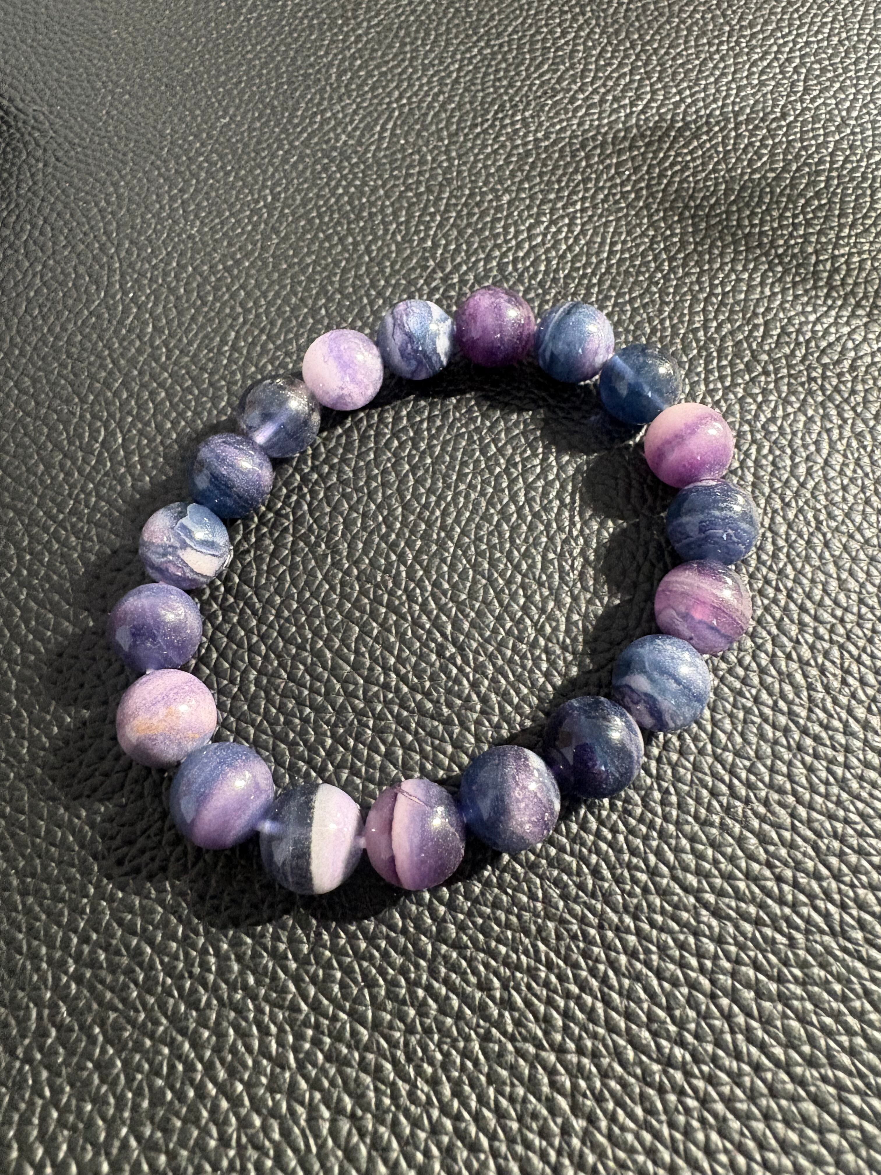 マッシブバンデッドフローライト (Massive BandedFluorite) は、ロシアで近年発見された紫色の濃淡が美しい希少な天然石です。ストライプ模様(バンデッド)が特徴で、石英や雲母が混在しており、癒しや思考の柔軟性、集中力を高める効果があるとされています。