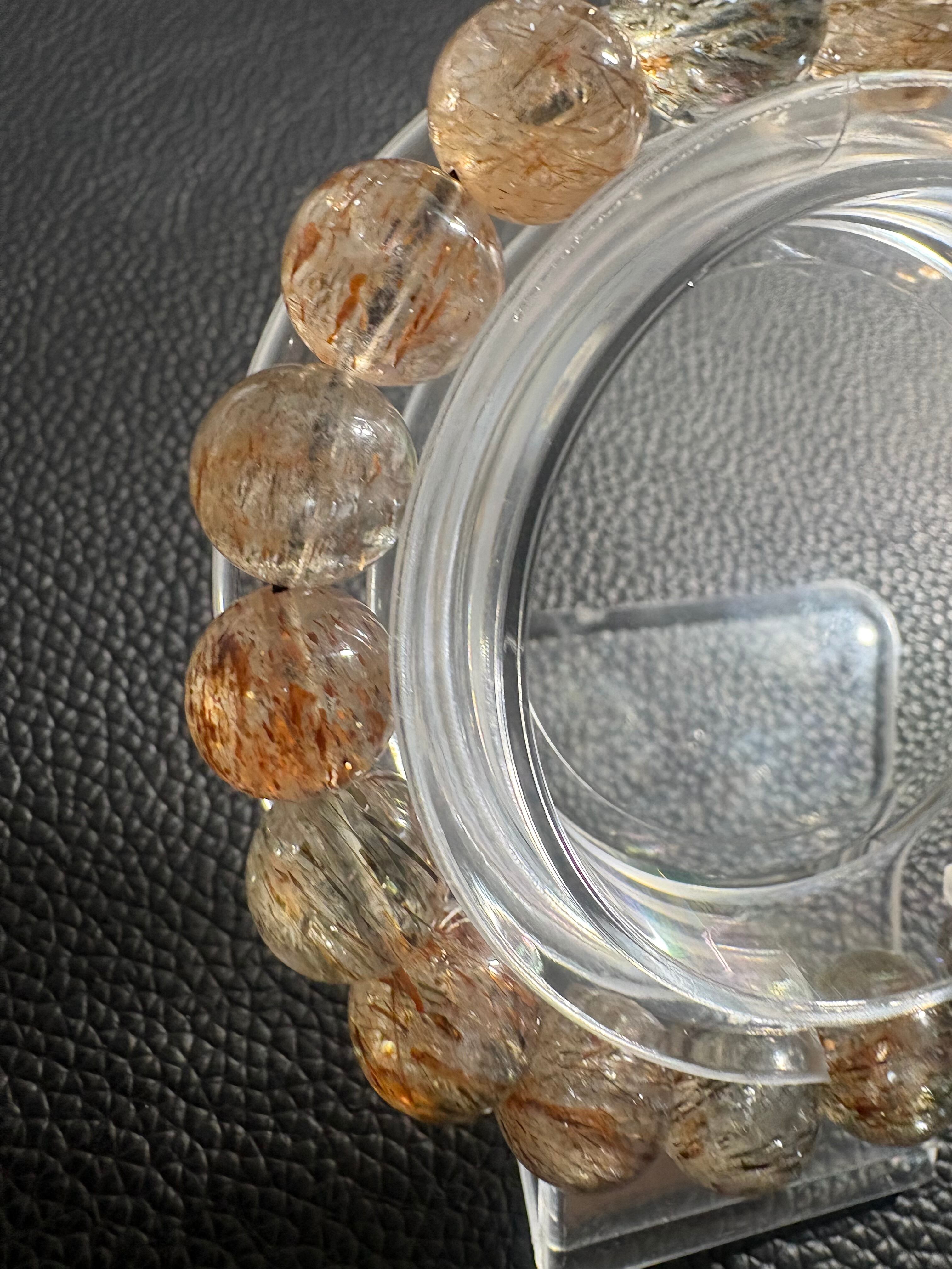 ブラック系の内包物と、ゴールド〜ブロンズカラーの繊細な針状インクルージョンが美しく共存するブラックゴールドスーパーセブン。