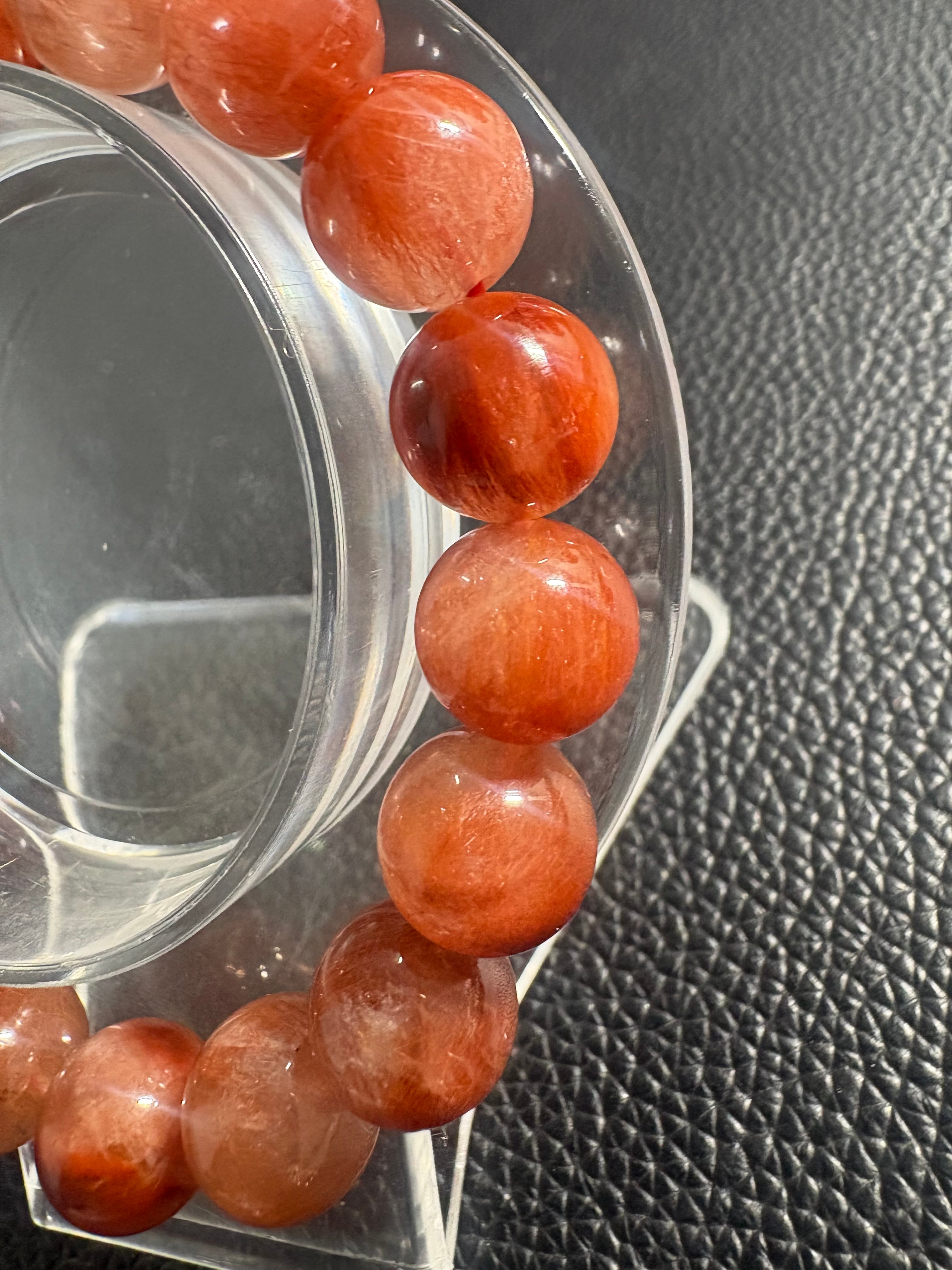 深みのあるレッドカラーに、ふんわりと舞うような内包物が美しいレッドラビットヘアのブレスレット。