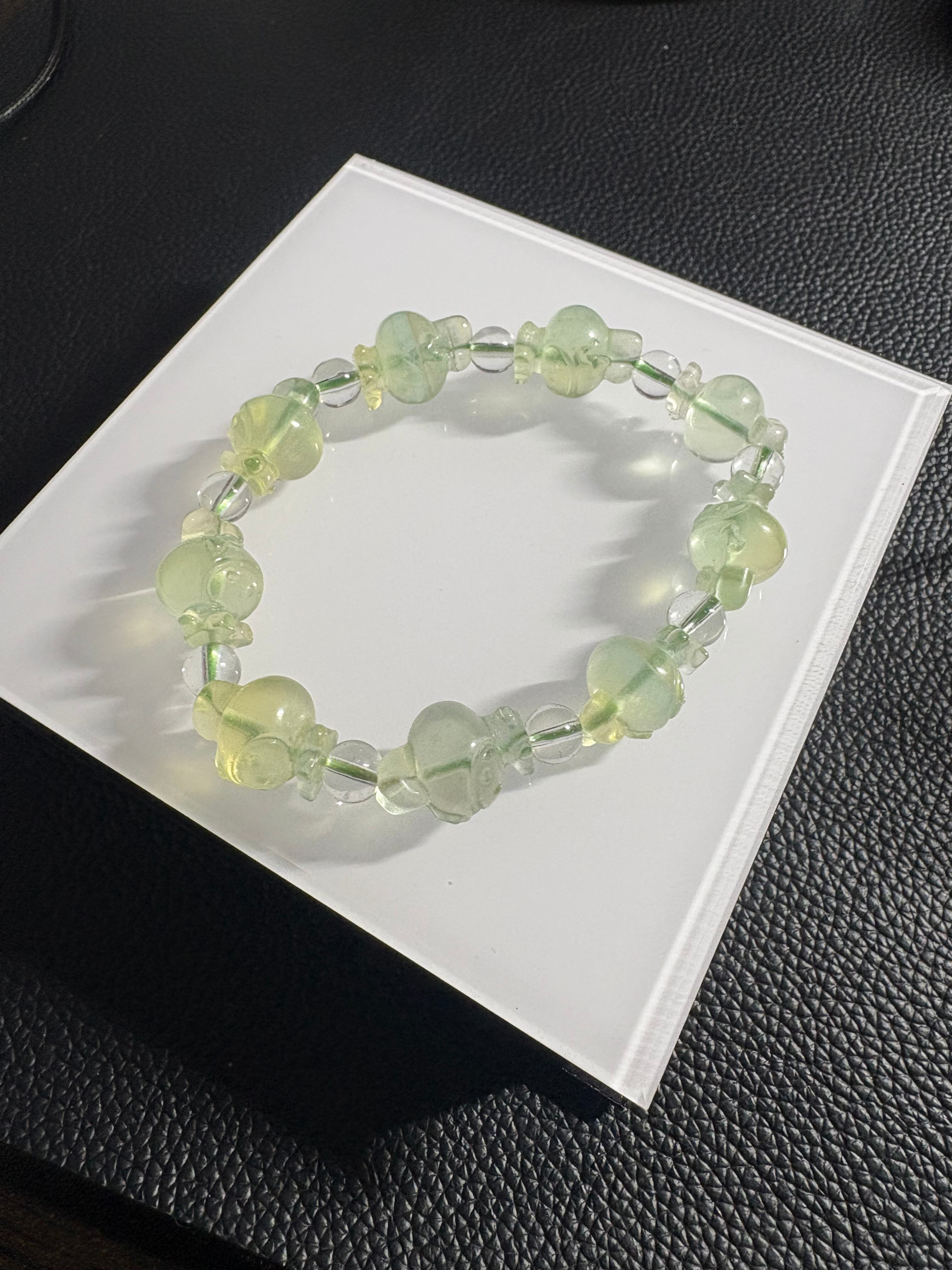 ころんと愛らしいキャラクター型のフローライトを贅沢にあしらった、遊び心あふれる天然石ブレスレット✨やわらかなグリーンの透明感と、ひとつひとつ異なる表情が手元を可愛く彩ります。間に入れたクリアビーズが全体をすっきりとまとめ、甘くなりすぎず大人の方にも身につけやすいデザインに仕上げました✨