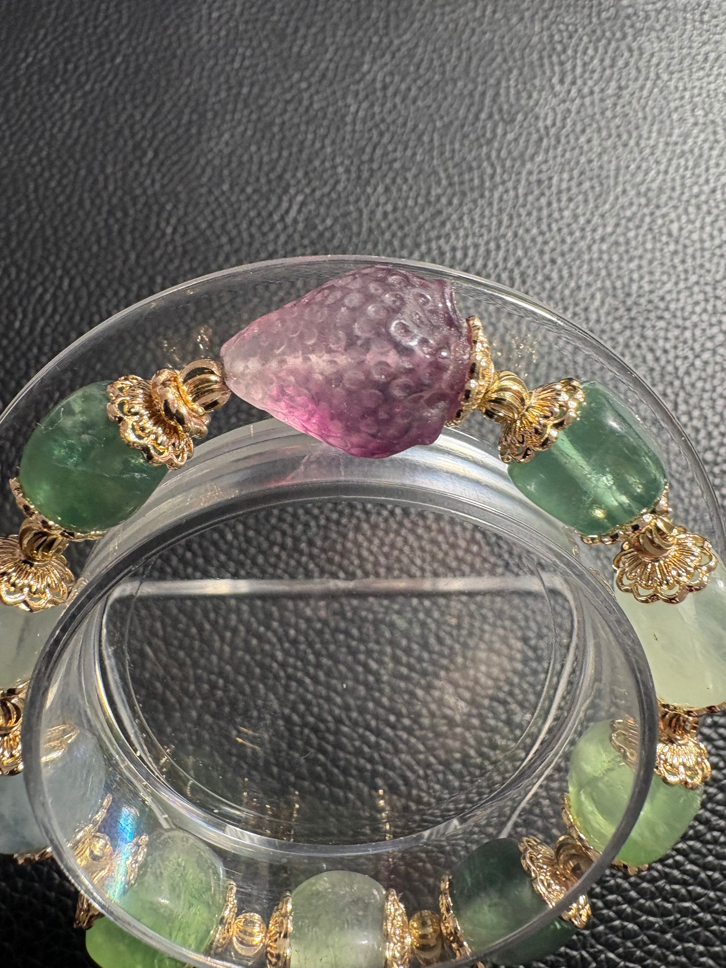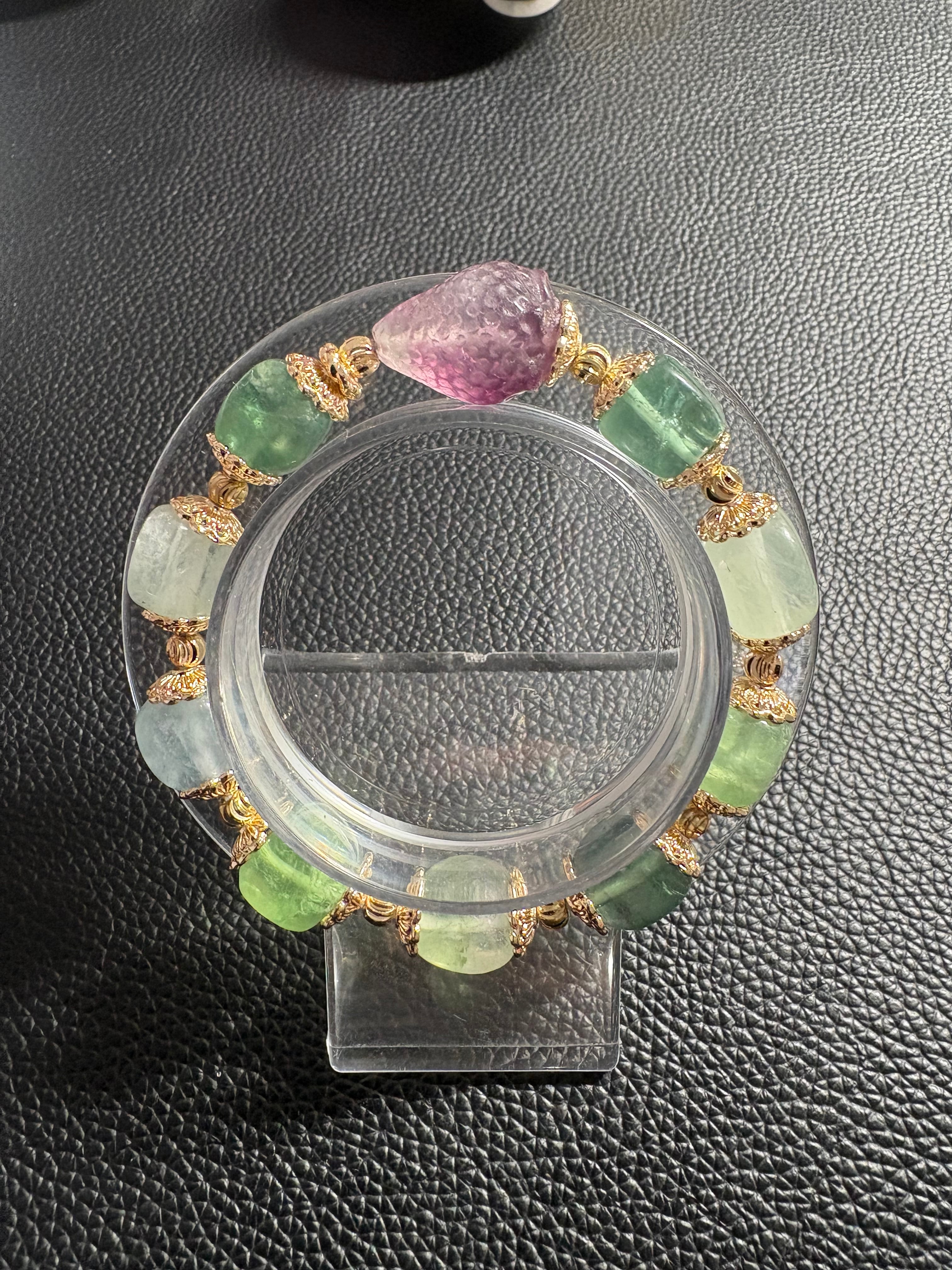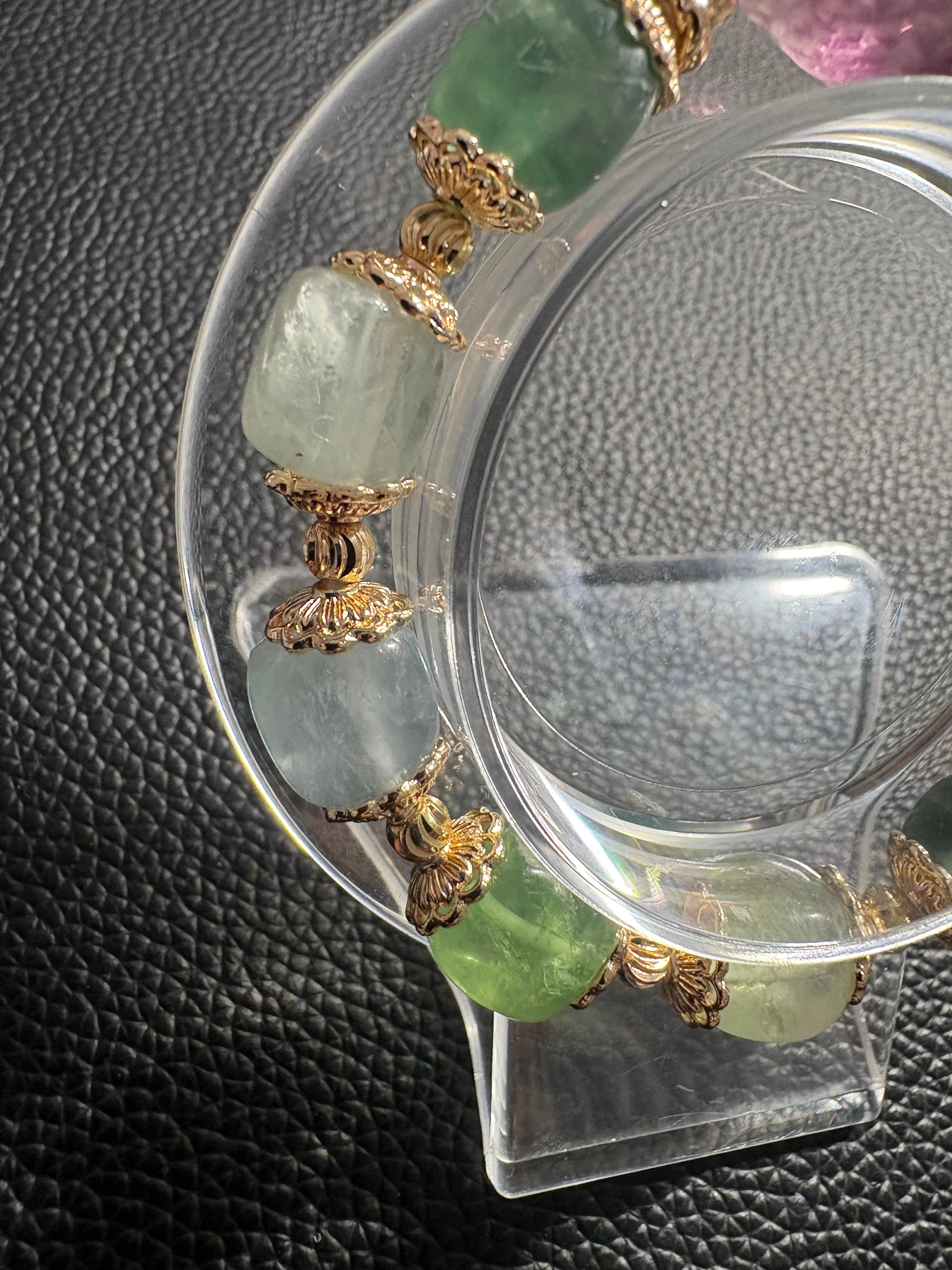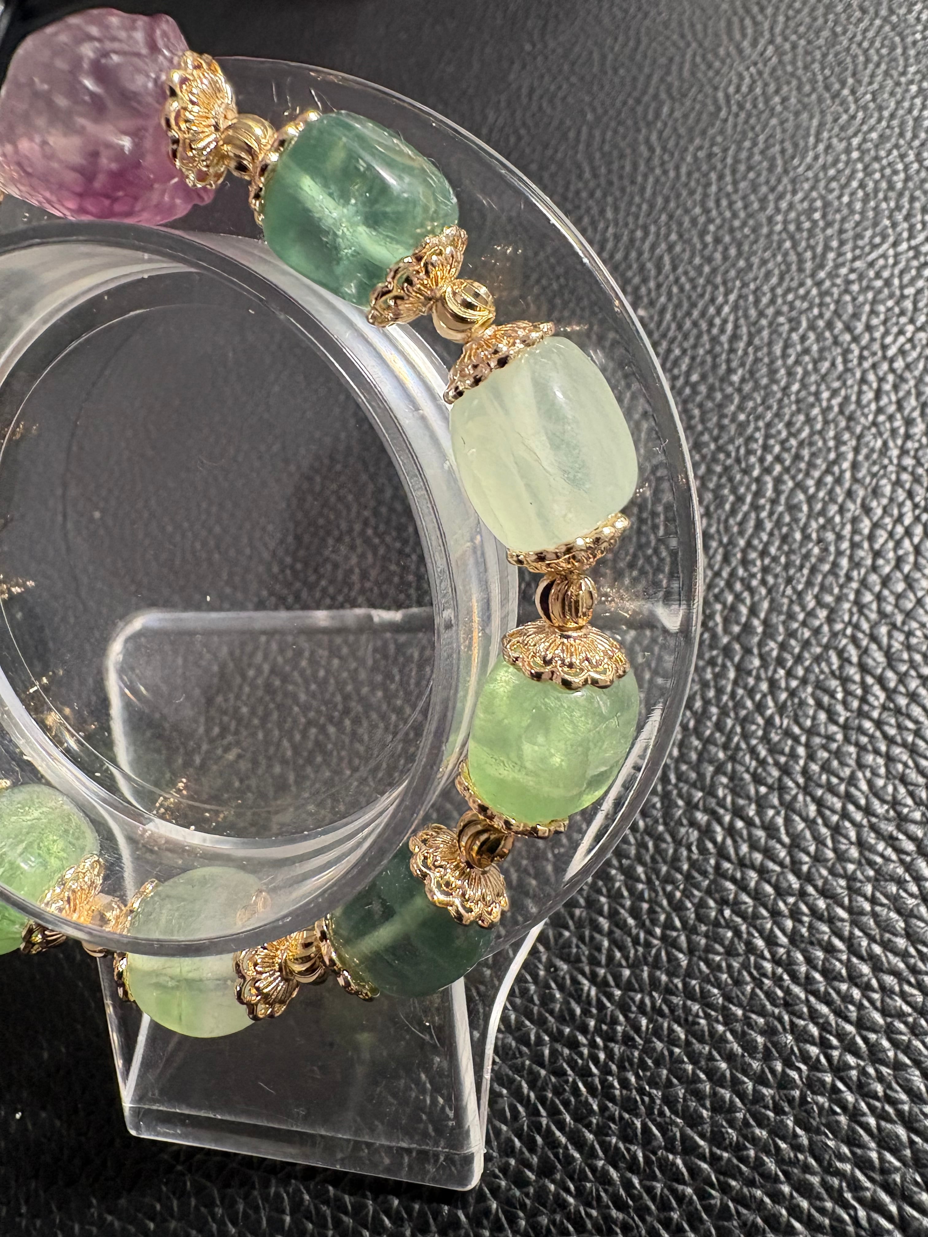 透明感のあるグリーンフローライトと、ポイントに美しいパープルフローライトをあしらったデザインブレスレットです✨