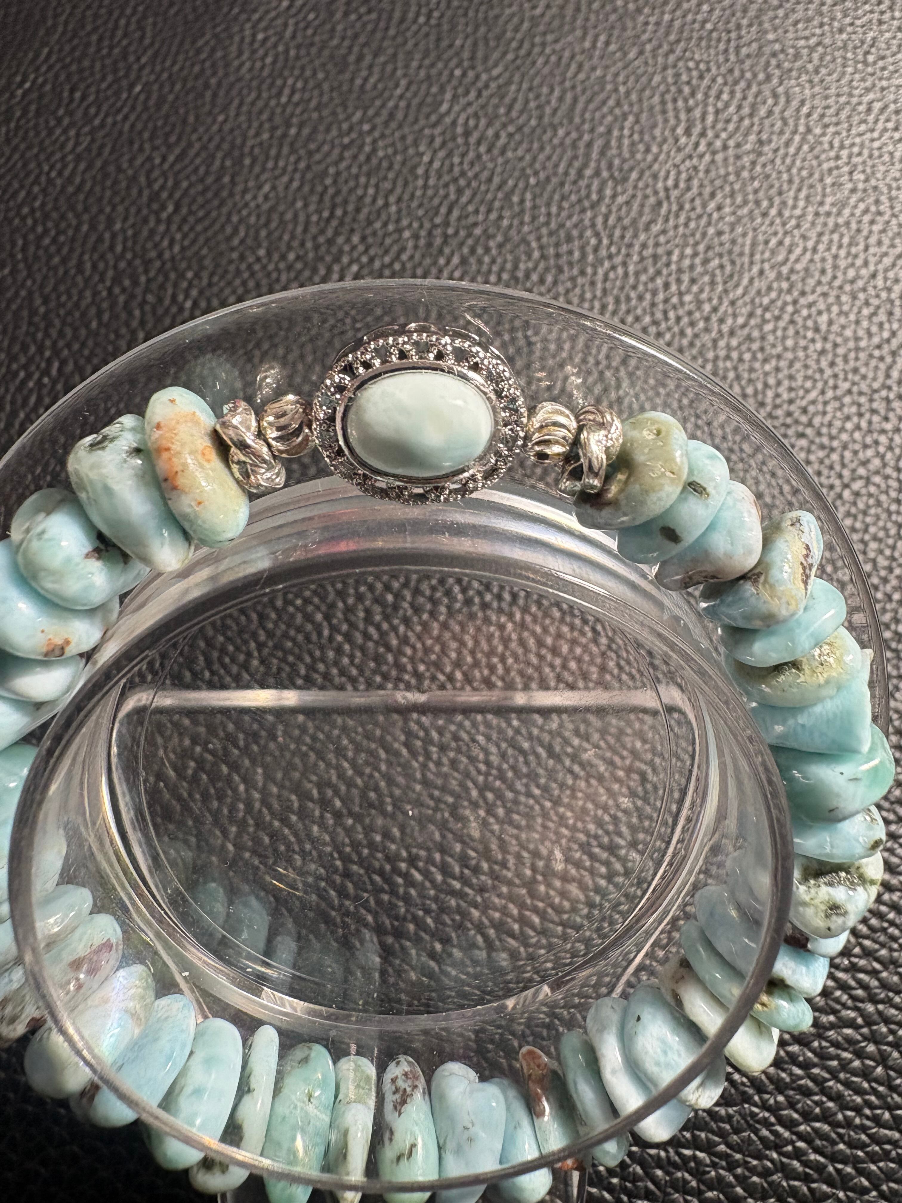 優しいブルーの中に、ブラウンやホワイトの模様が混ざり合う個性的で味わい深いチョコラリマー を使用した細石ブレスレットです✨