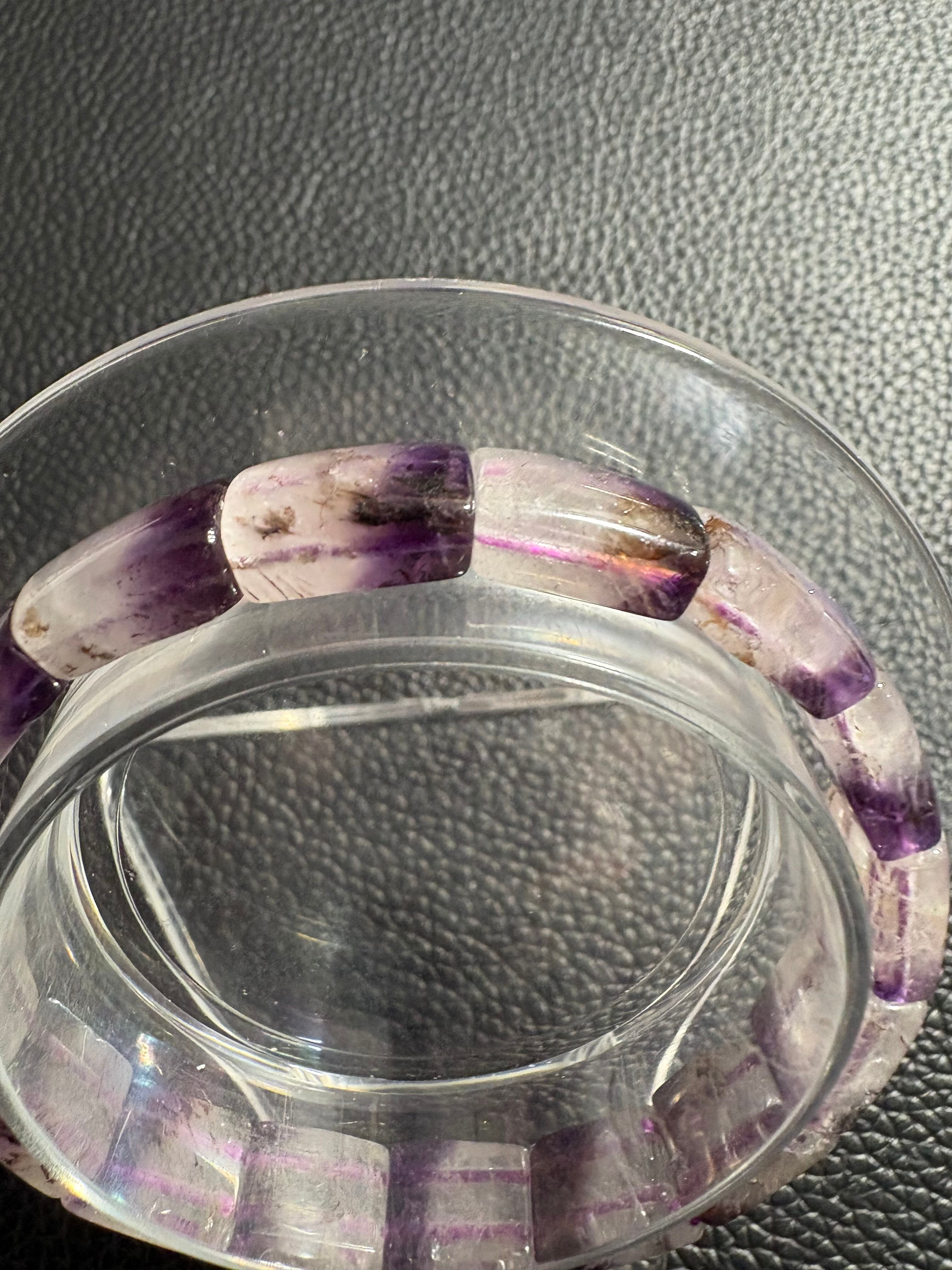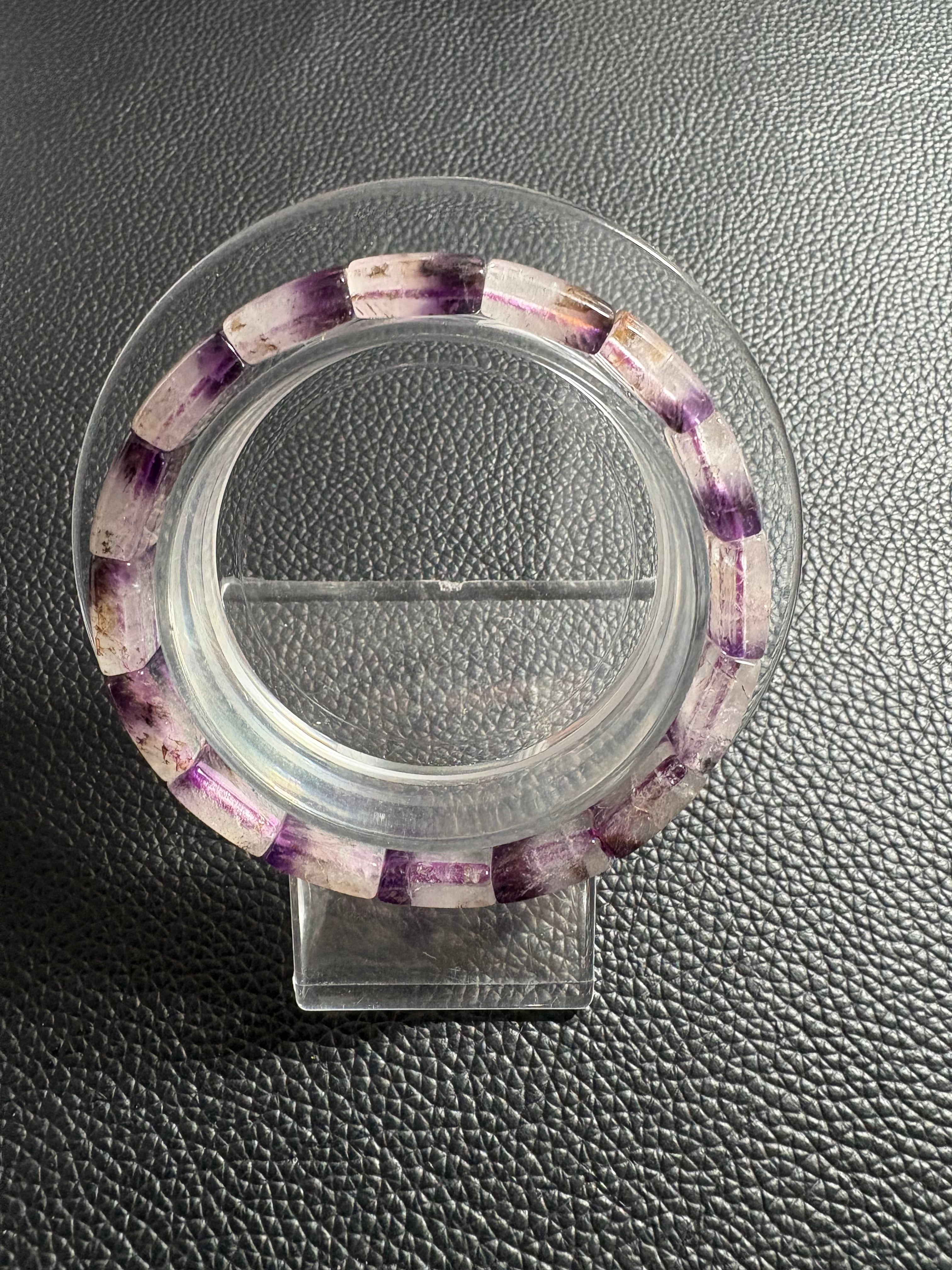 こちらのバングルは、透明感のある水晶部分と美しいパープルカラーが混ざり合い、一粒一粒に個性のある表情を楽しめる魅力的な仕上がりになっています。角ばったバングルタイプのデザインは、通常の丸玉ブレスレットとはまた違った存在感があり、手元を上品で落ち着いた雰囲気に演出してくれます☆