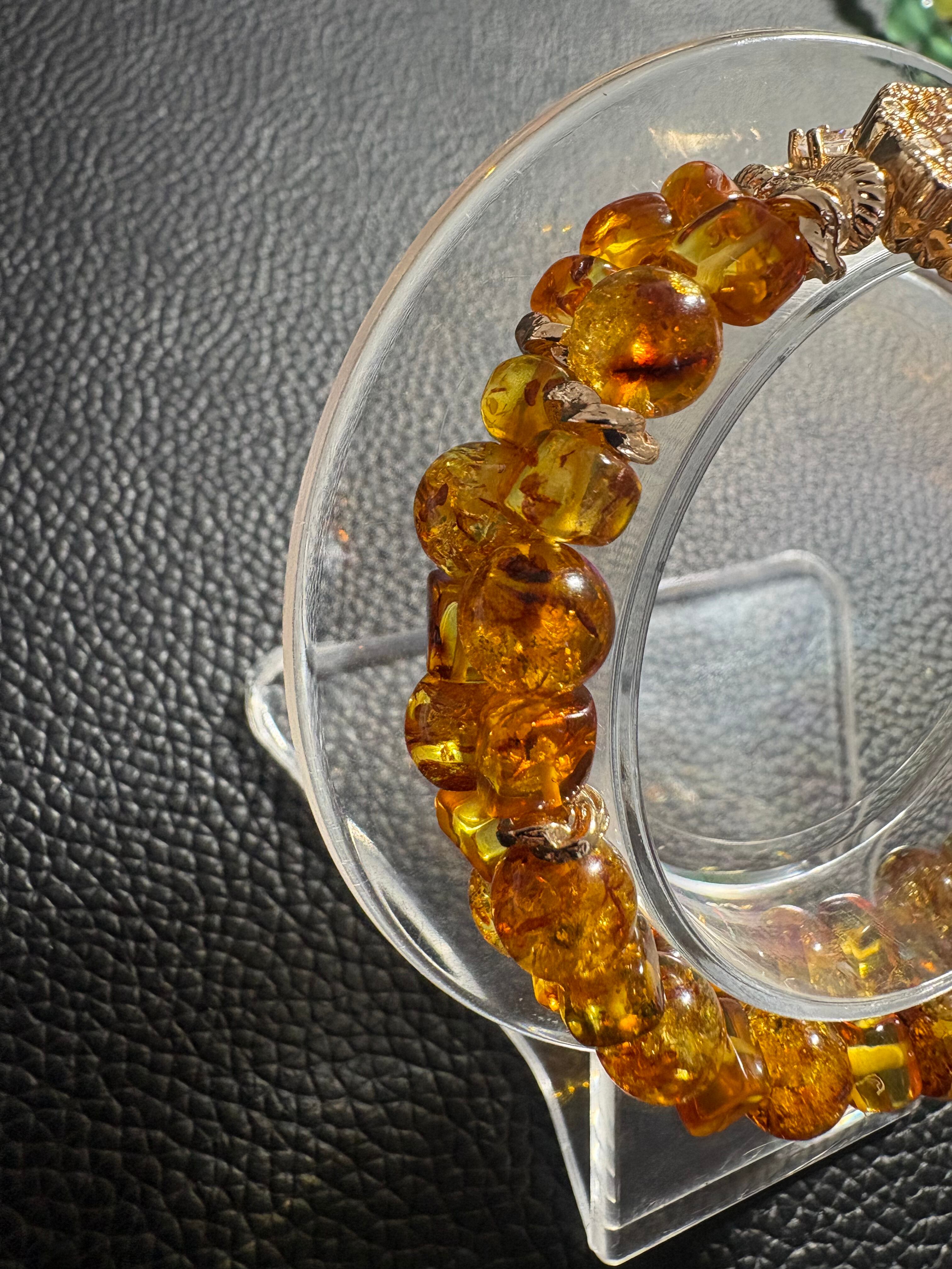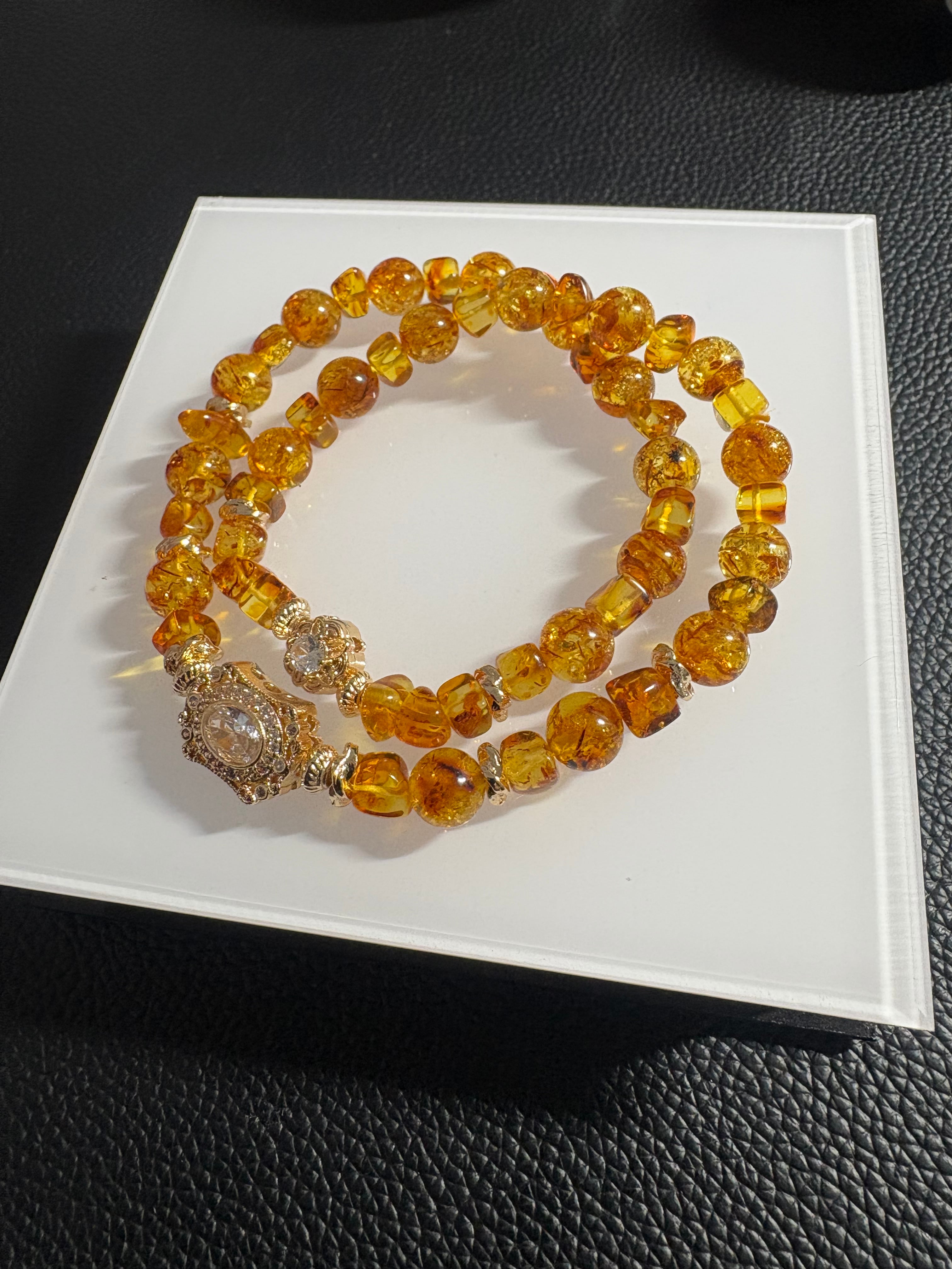 透明感のある黄金色が美しい天然アンバー(琥珀)を使用した2連デザインブレスレットです✨アンバー特有の温かみのあるカラーと、内包された自然の表情がとても魅力的✨