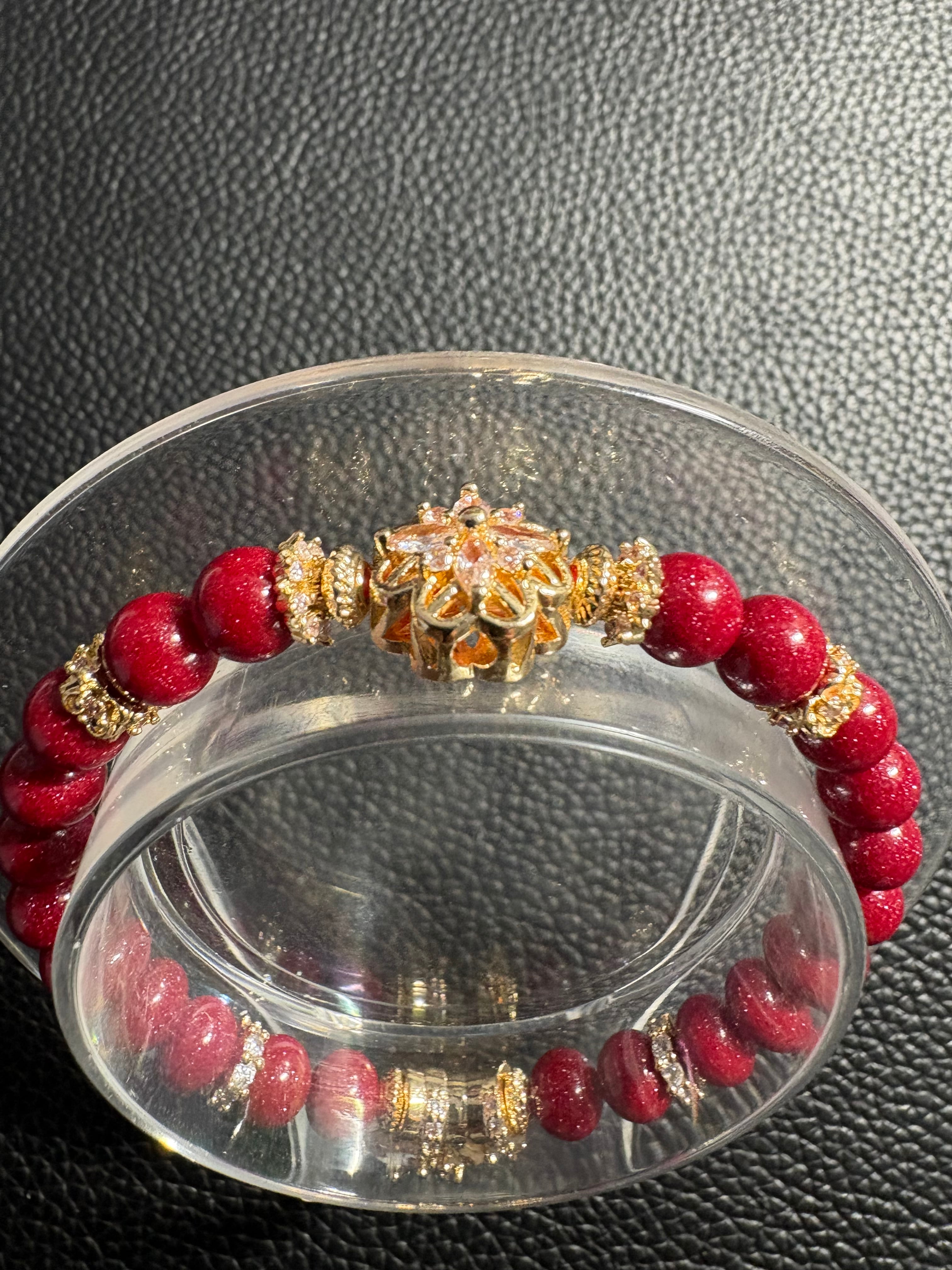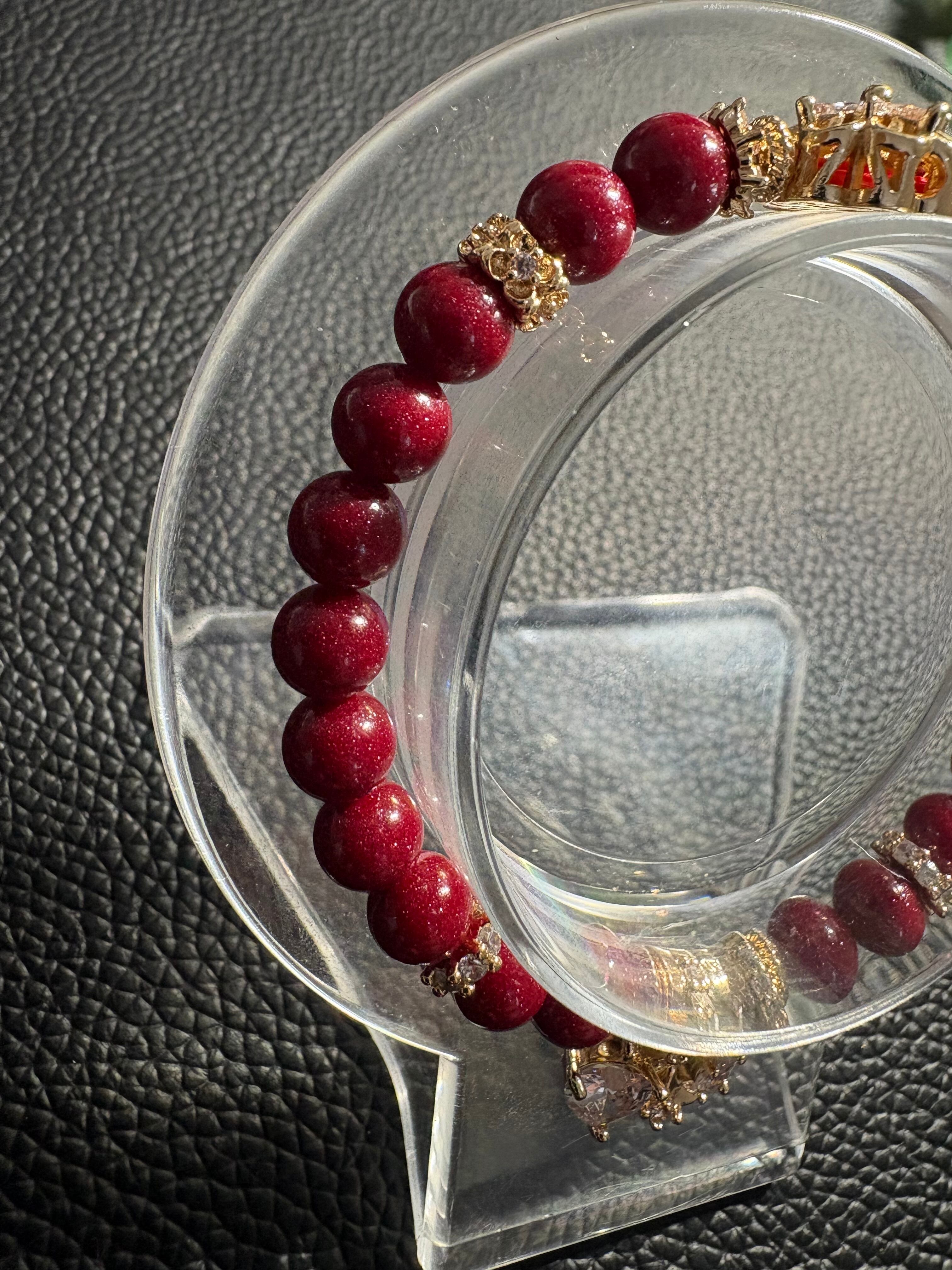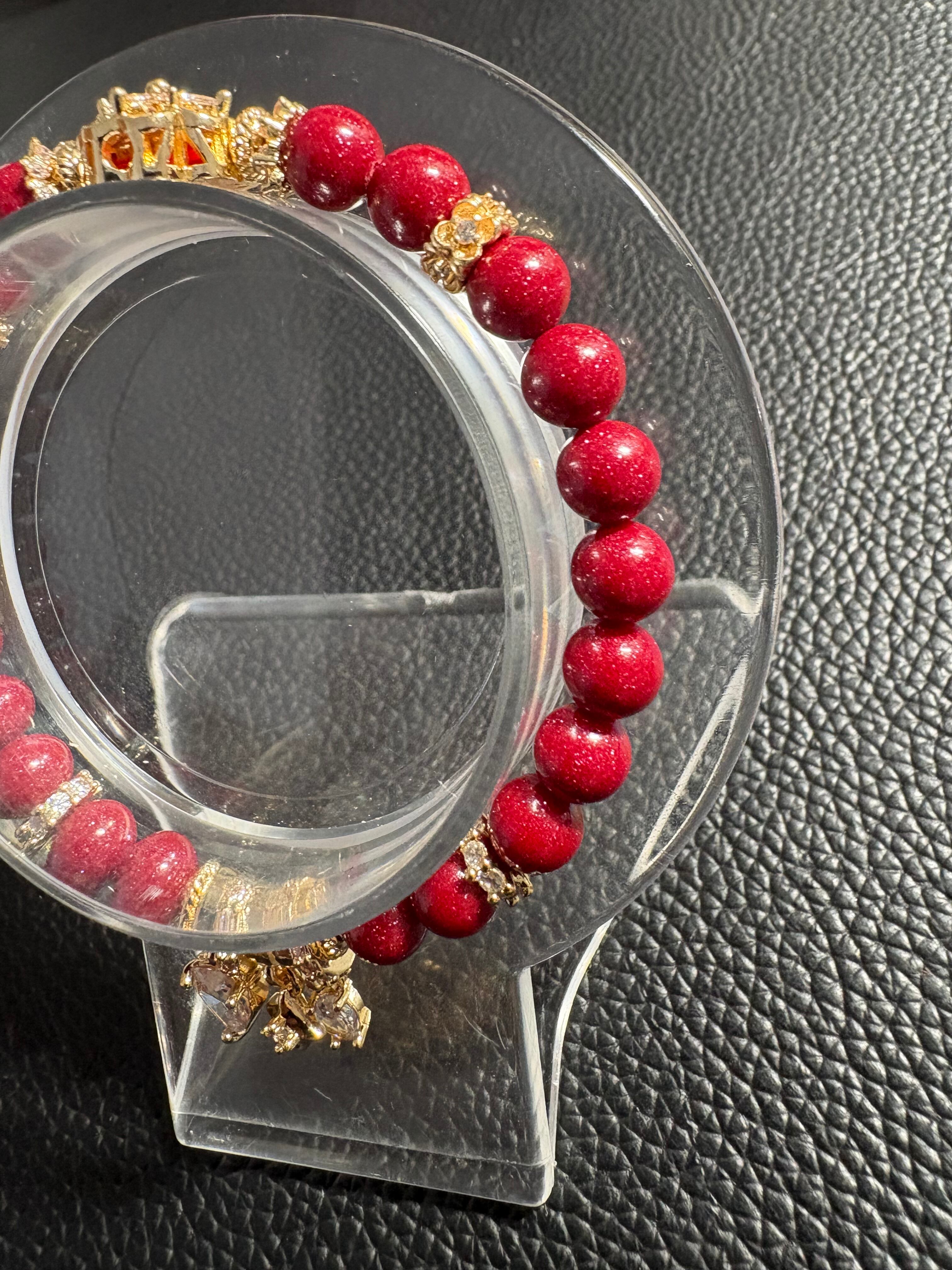 深みのある鮮やかなレッドが美しい「辰砂(しんしゃ)」を使用した、存在感抜群のデザインブレスレットです✨上品なきらめきを放つ装飾パーツを組み合わせ、華やかさと力強さを兼ね備えた一本に仕上げました☆