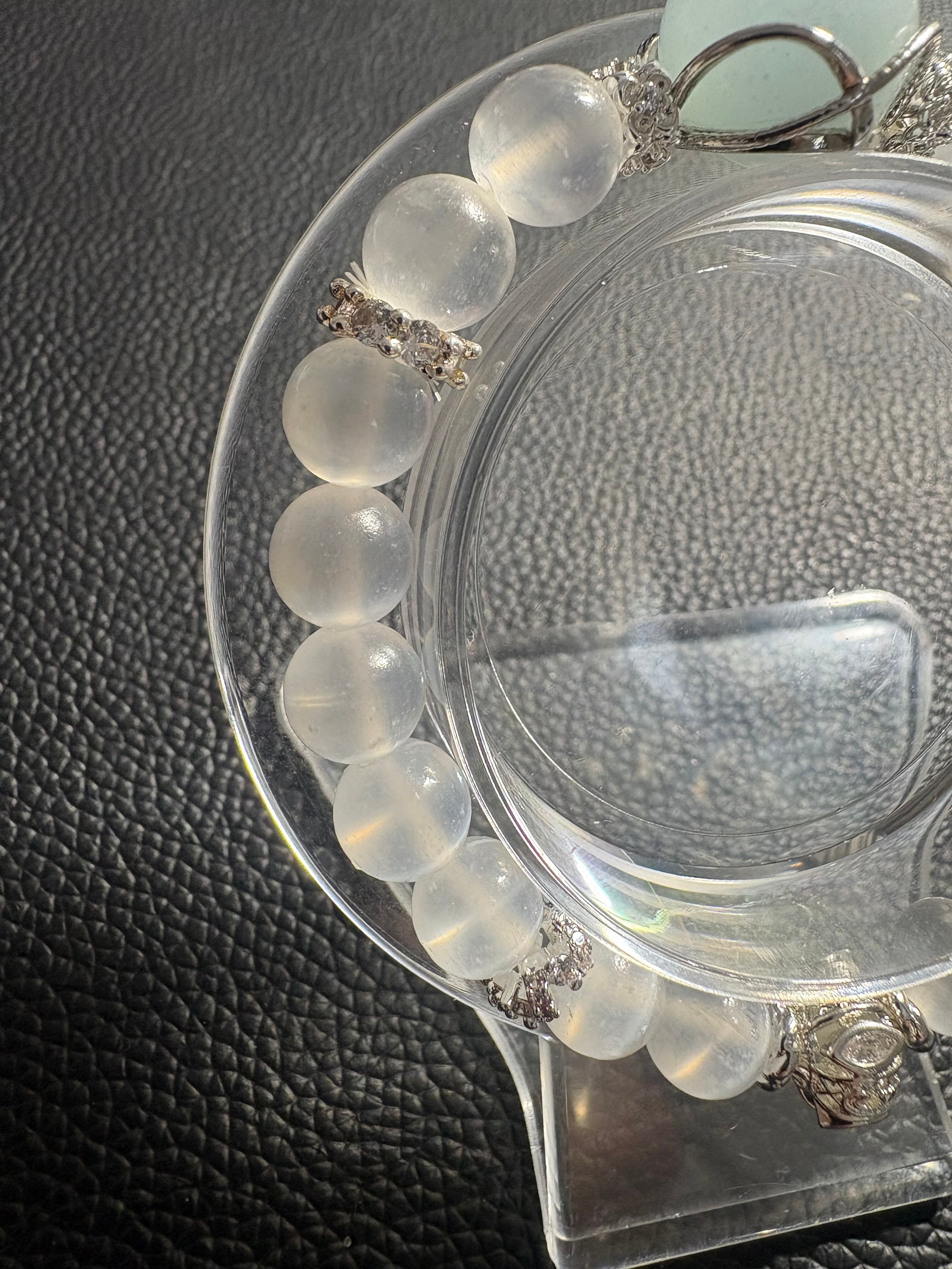 やわらかなミルキーホワイトの輝きが美しいセレナイトに、爽やかなブルーのアクアマリンをポイントに添えたデザインブレスレットです✨
