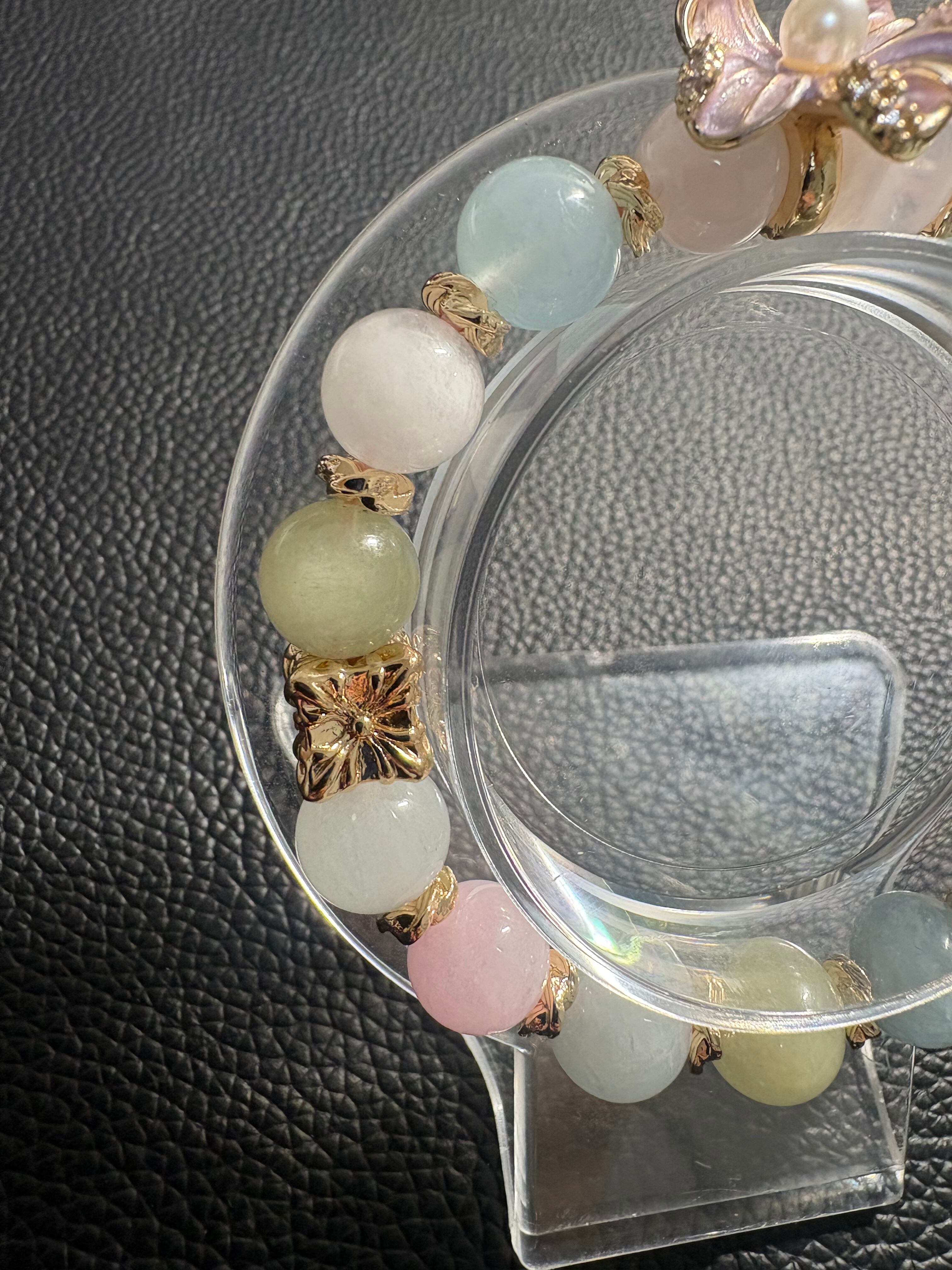 優しいパステルカラーが魅力のモルガナイトを使用した、華やかなデザインブレスレットです✨ピンク・ブルー・イエロー・ホワイトなど、淡く柔らかな色合いが手元をふんわりと彩り、上品で女性らしい雰囲気を演出します✨