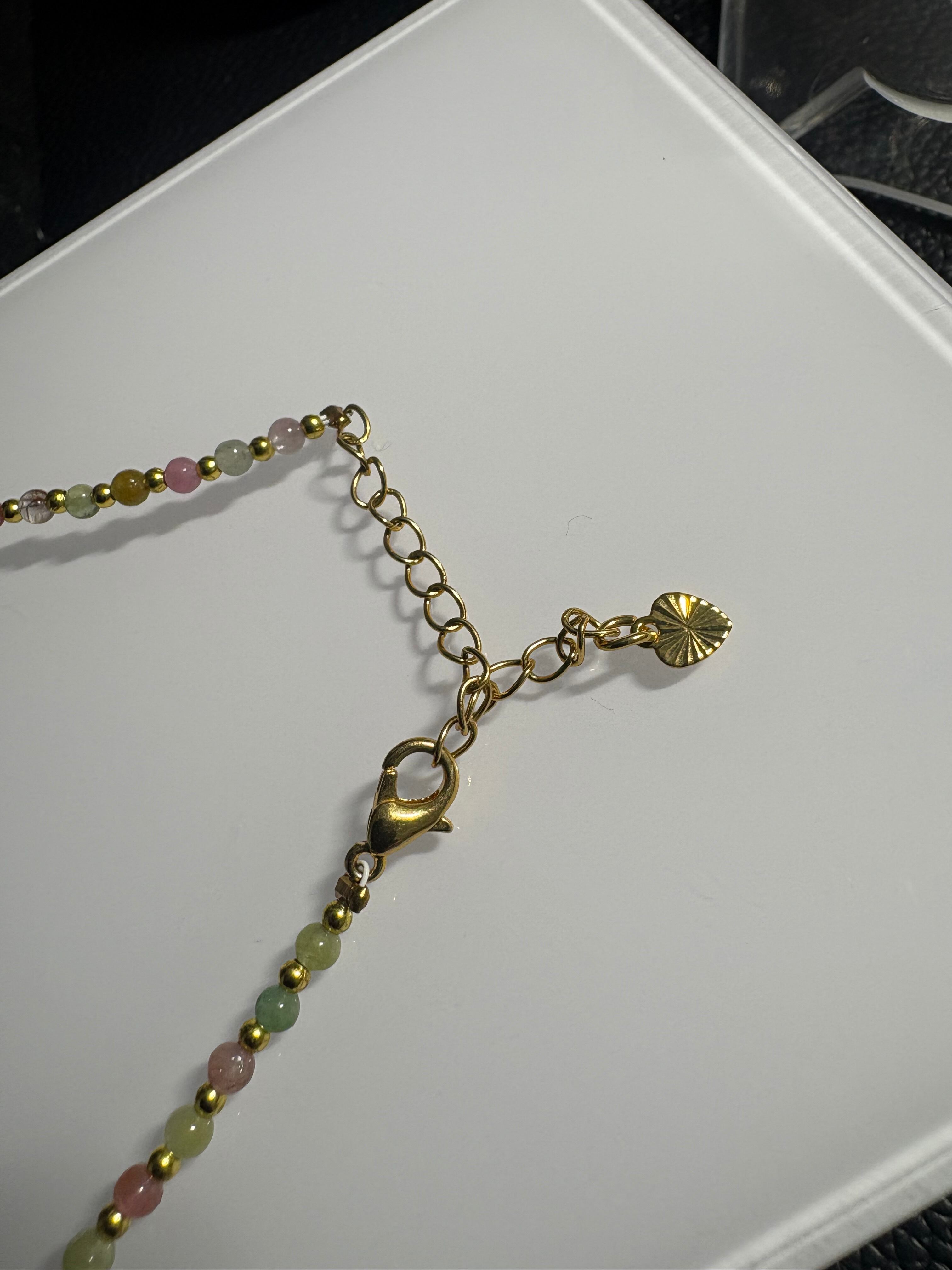 ネックレス部分には約2.8ミリの天然マルチカラースピネルを使用し、ピンク・グリーン・イエローなどのナチュラルカラーが首元を華やかに彩ります✨細身ながらもしっかりとした輝きがあり、大人可愛い雰囲気に仕上がっています☆