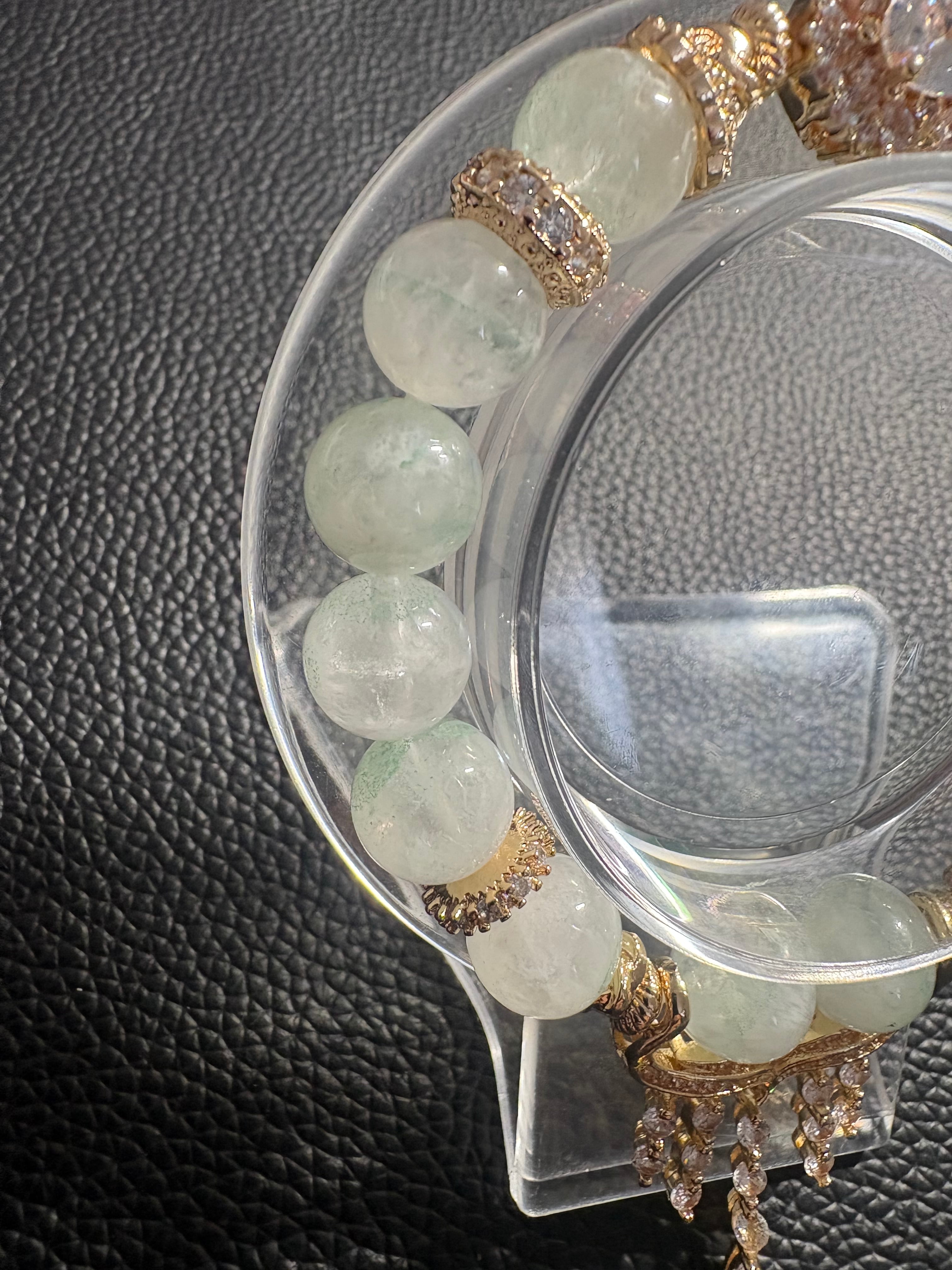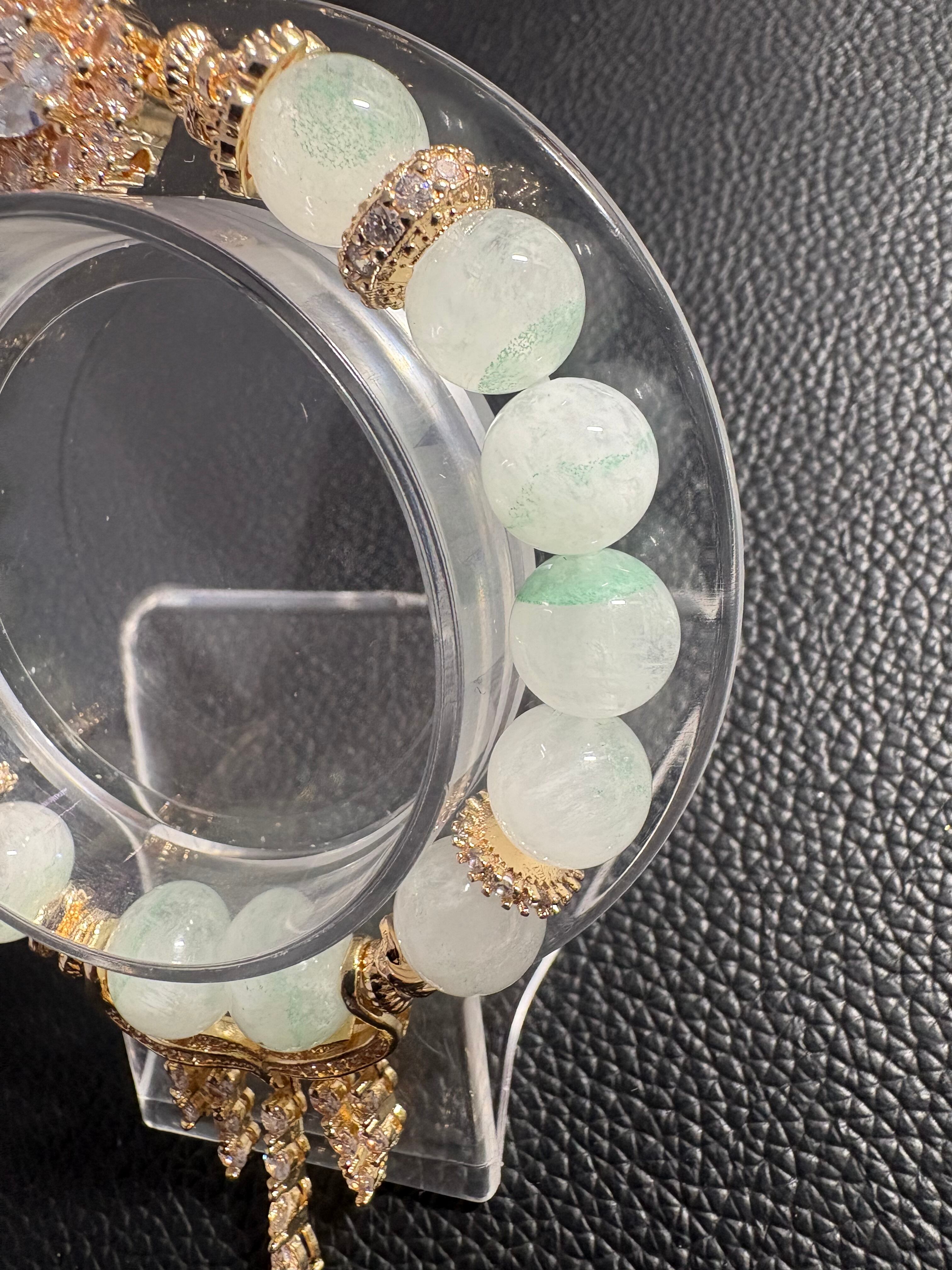淡いグリーンの優しい色合いは、癒しと前向きなエネルギーを与えてくれると言われています✨華やかなゴールド系デザインパーツと揺れるチャームをアクセントに取り入れ、天然石のナチュラルな魅力の中に上品な高級感をプラス✨
