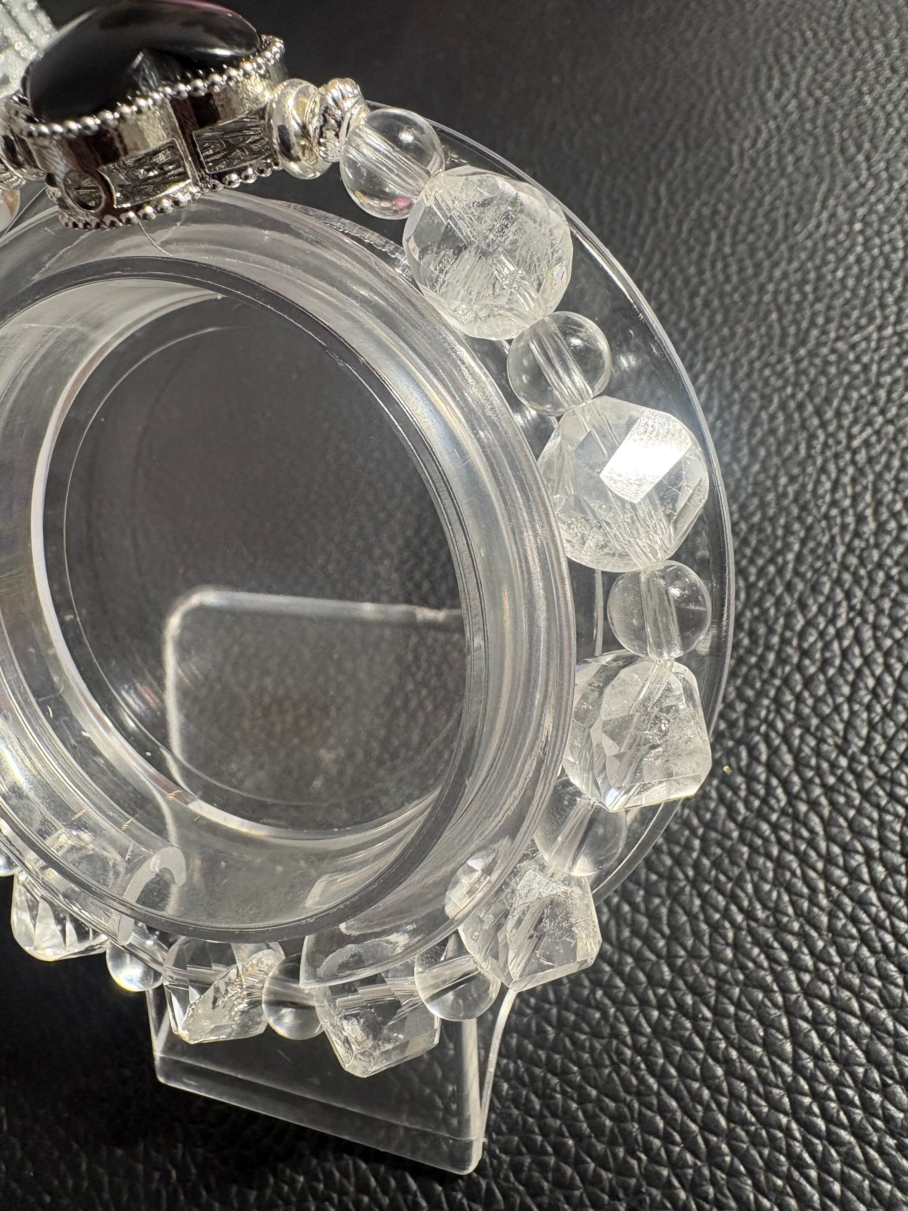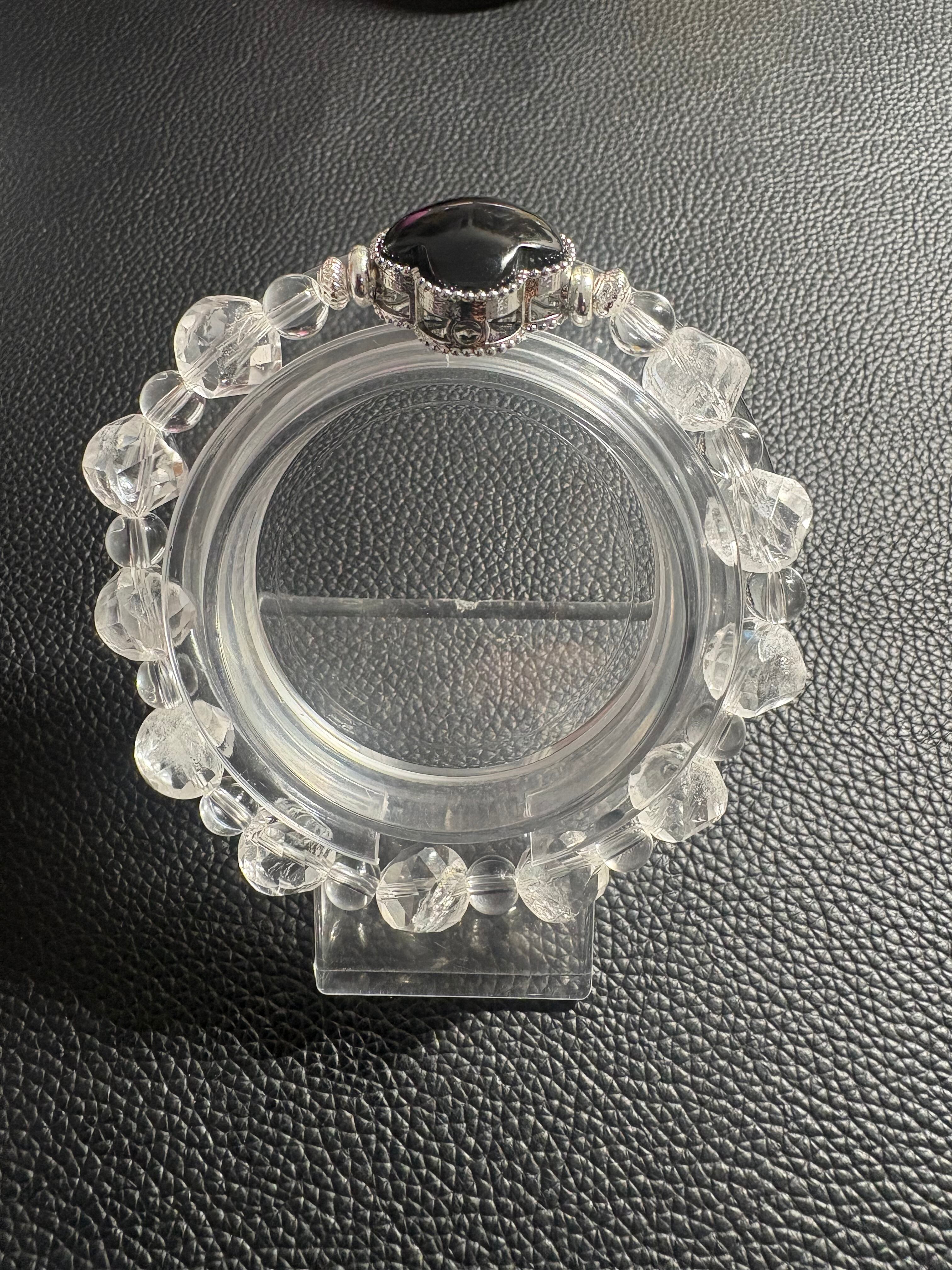 存在感のあるオニキスのクローバーモチーフを主役に、透明感あふれるクリスタルで仕上げたデザインブレスレットです✨