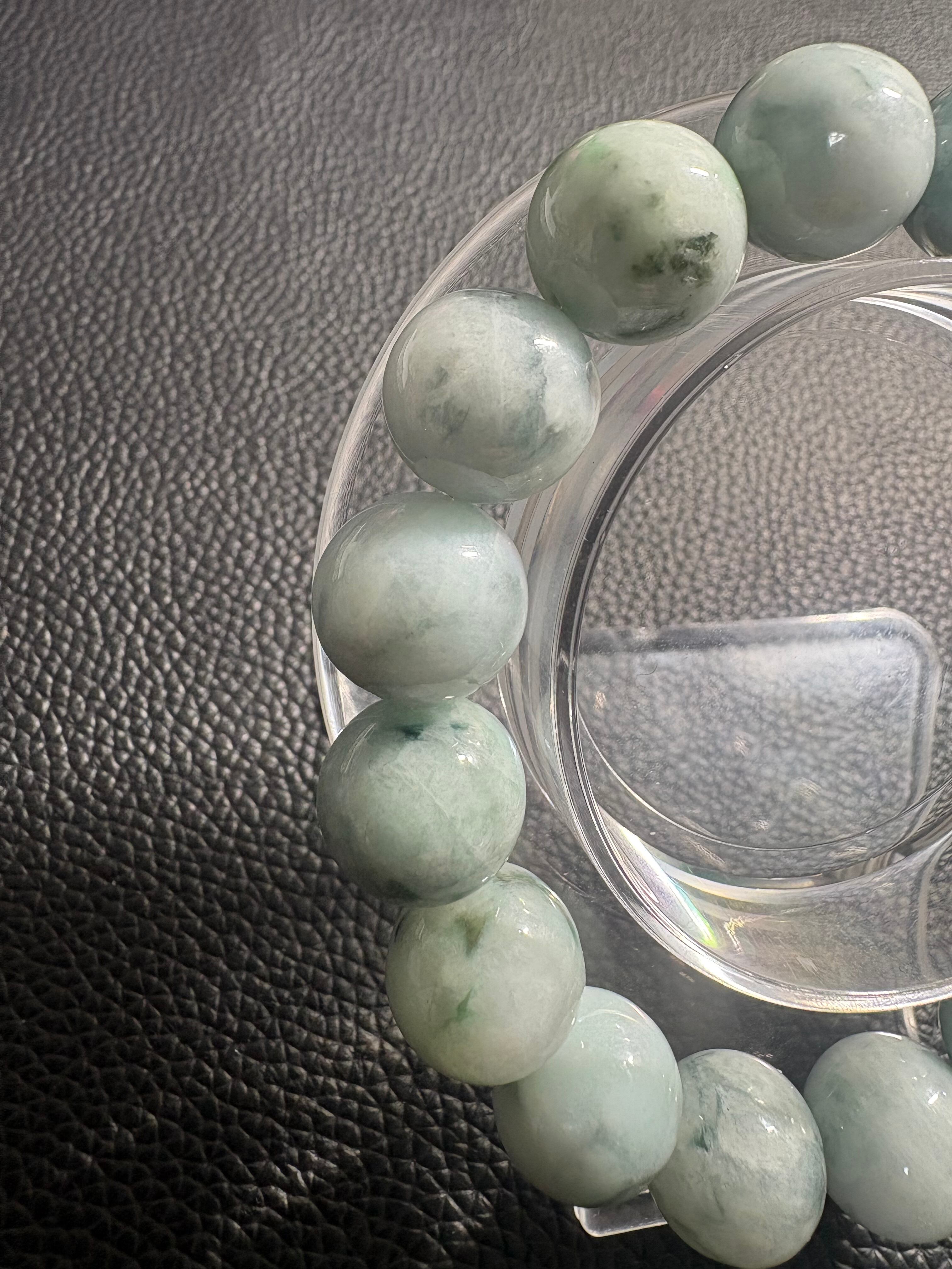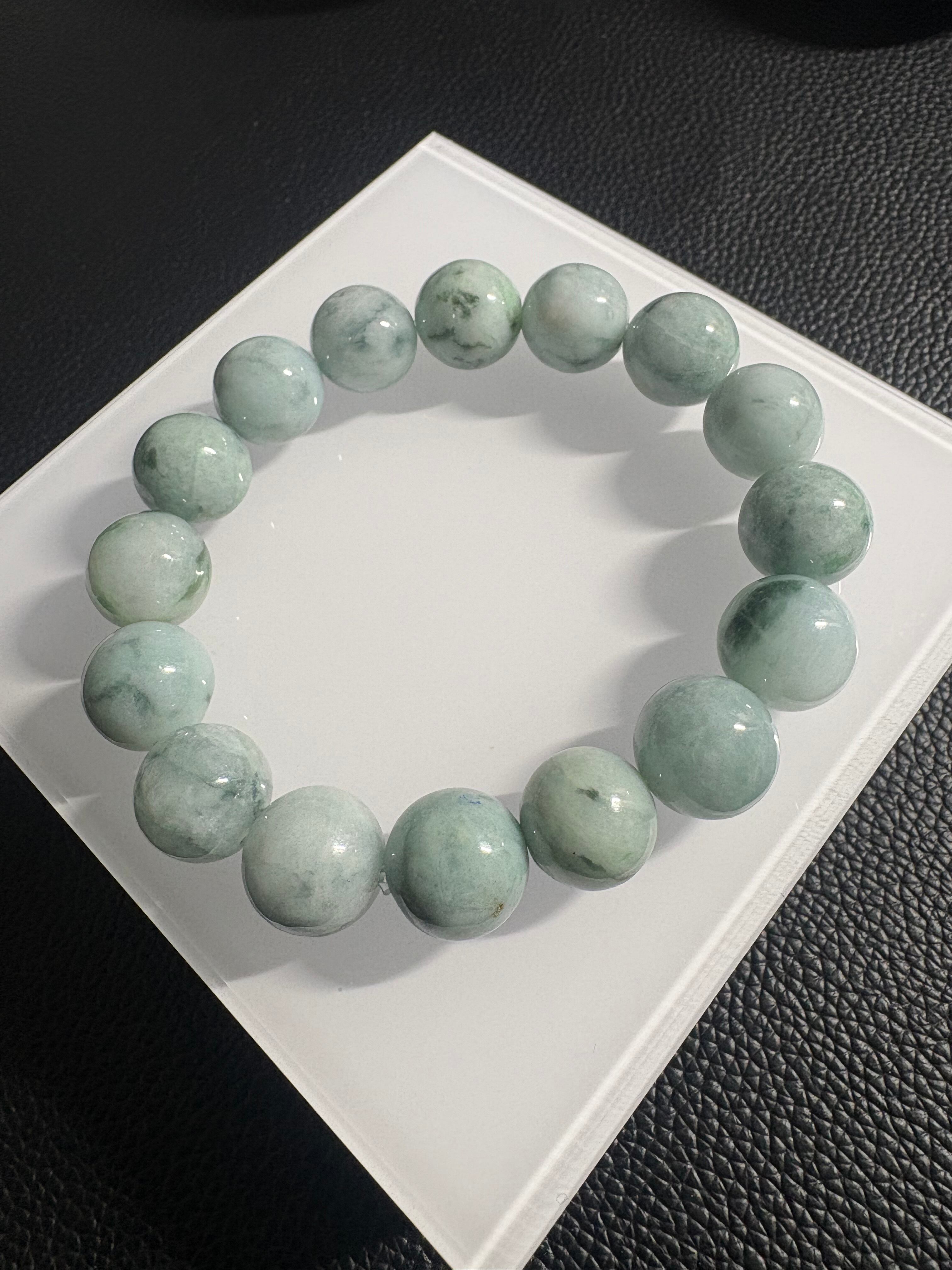 やわらかなグリーンと白が溶け合う、ナチュラルな風合いが魅力のミャンマー翡翠ブレスレット✨ 13mmの存在感あるサイズながら、淡い色合いが手元にやさしく馴染み、重たく見えないのが特徴です☆