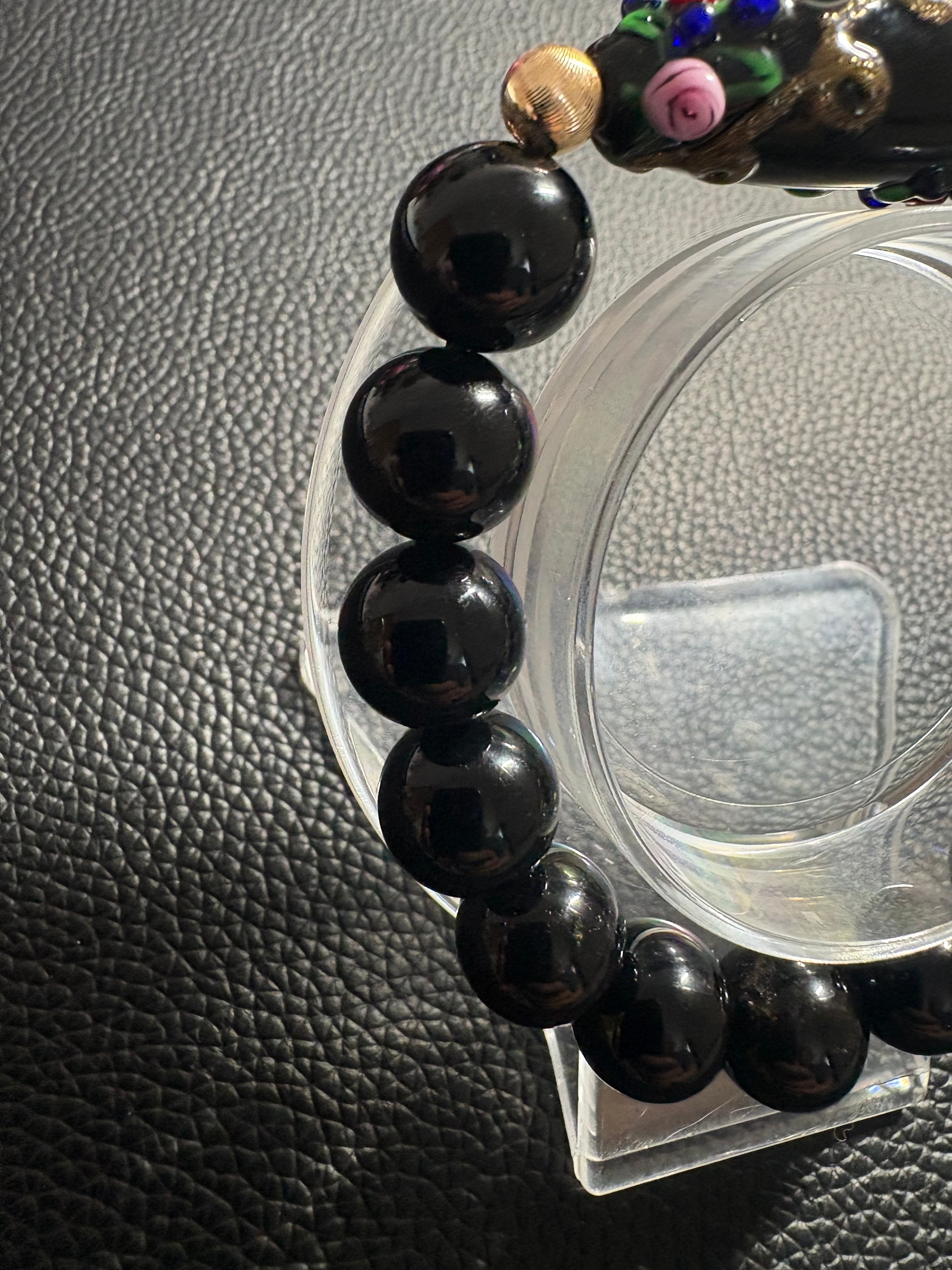 約11.5mmのモリオンを使用し、重厚感と高級感のある仕上がり☆ 艶やかなブラックが全体を引き締め、中央の天珠の個性をより一層引き立てています✨