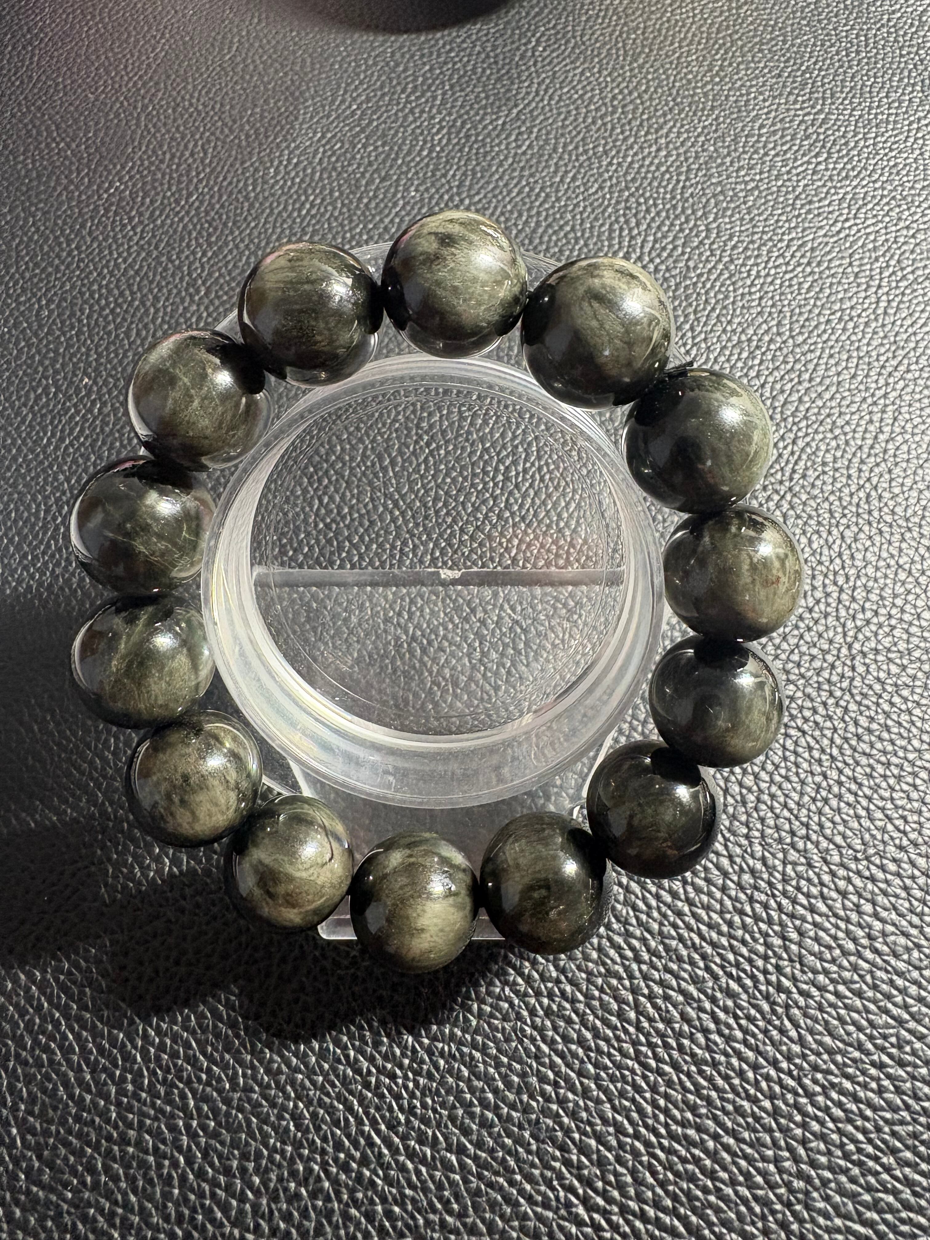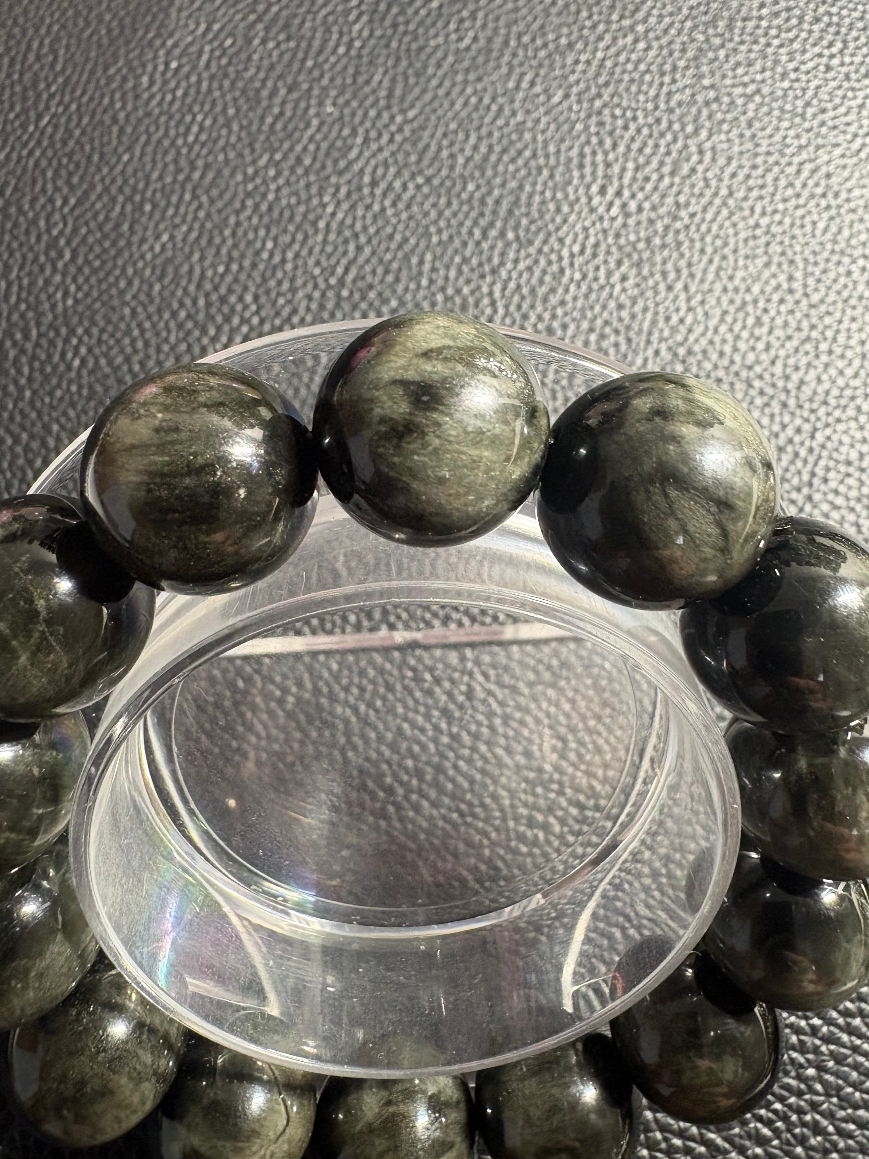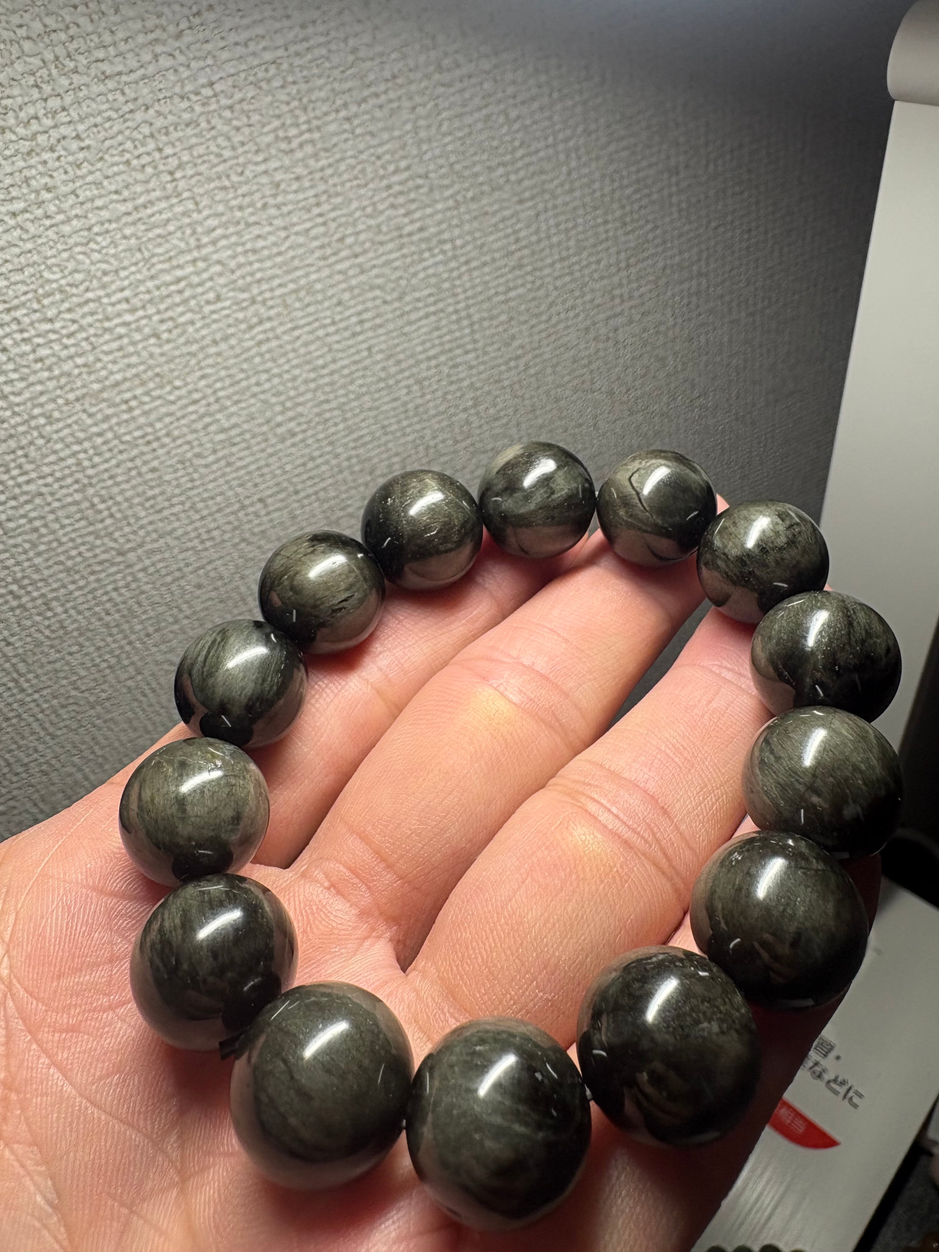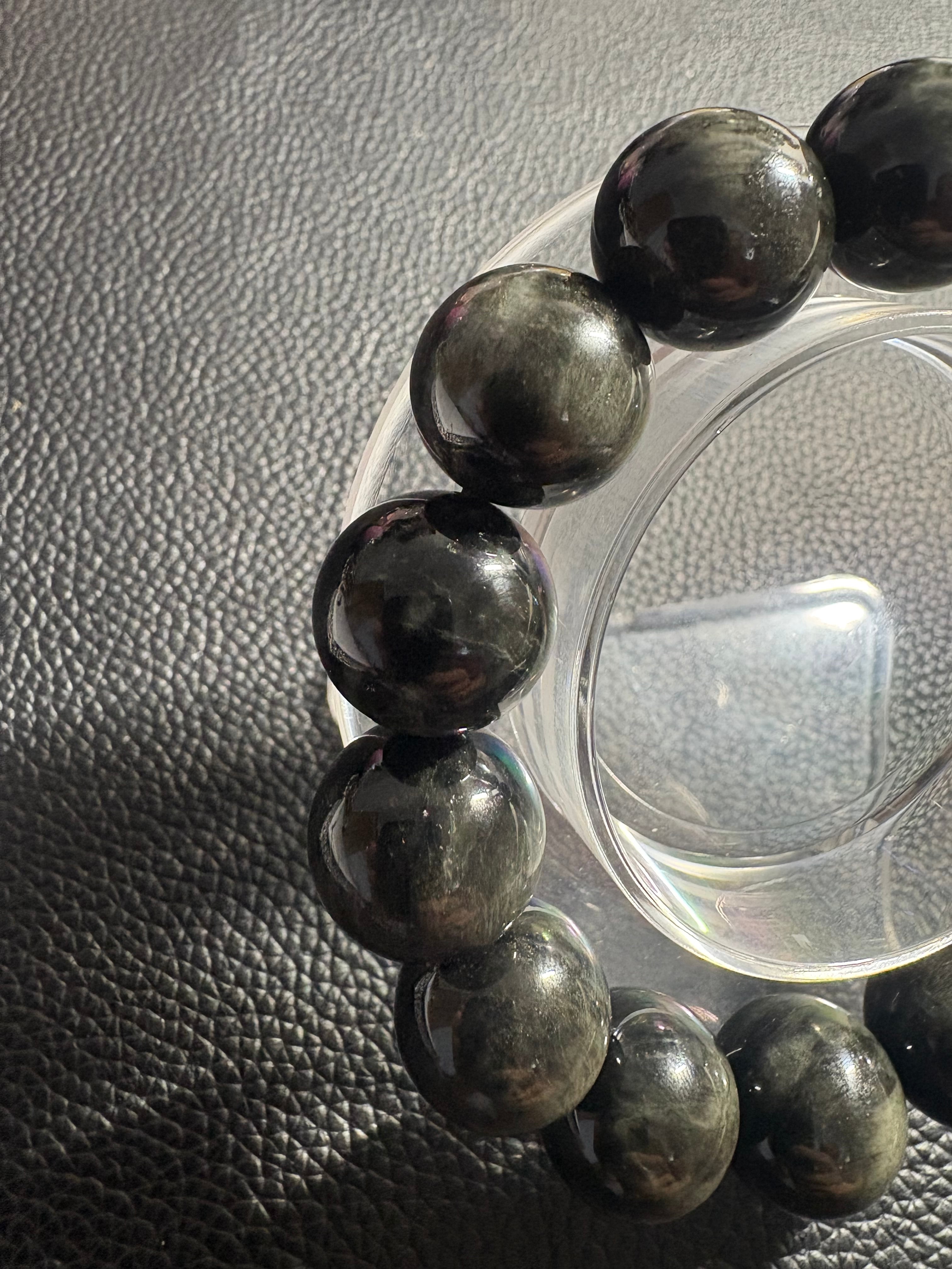 深みのある漆黒に、光の角度で浮かび上がる美しいシラー✨落ち着いた重厚感と力強さを兼ね備えた「ブラックイーグルアイ」のブレスレットです✨